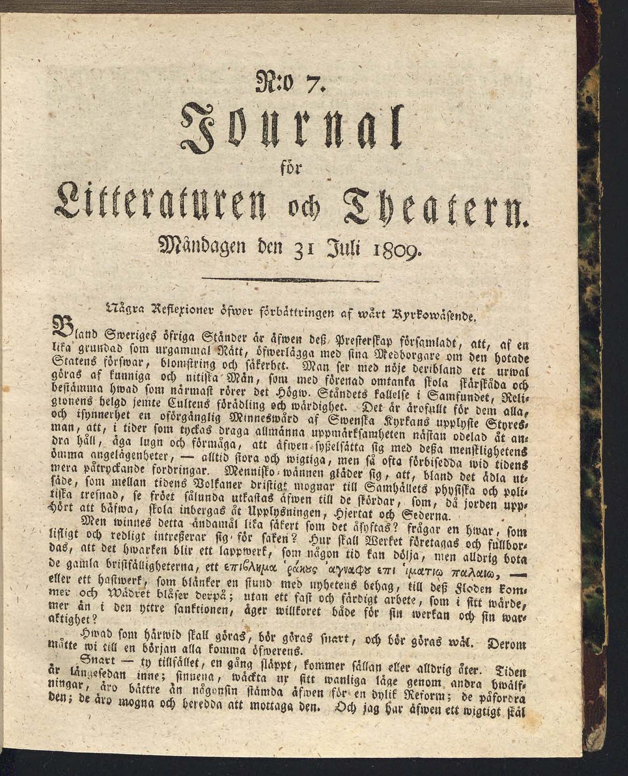 Full resolution (JPEG) - On this page / på denna sida - N:o 7. Måndagen den 31 Juli 1809 - Några Reflexioner öfwer förbättringen af wårt Kyrkowäsende