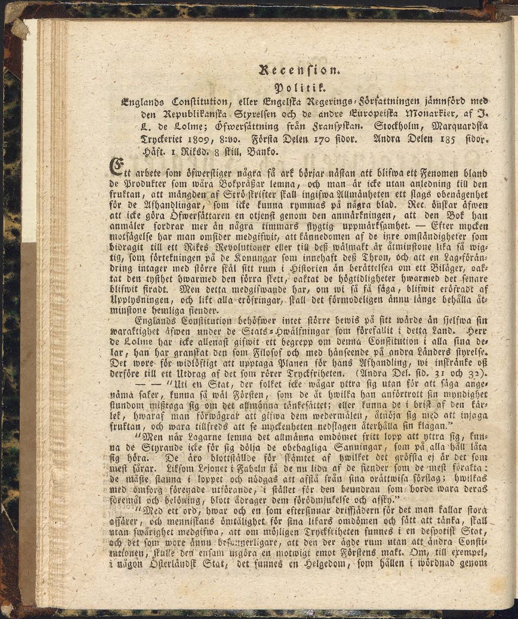 Full resolution (JPEG) - On this page / på denna sida - N:o 10. Måndagen den 7 Augusti 1809 - Recension. Politik