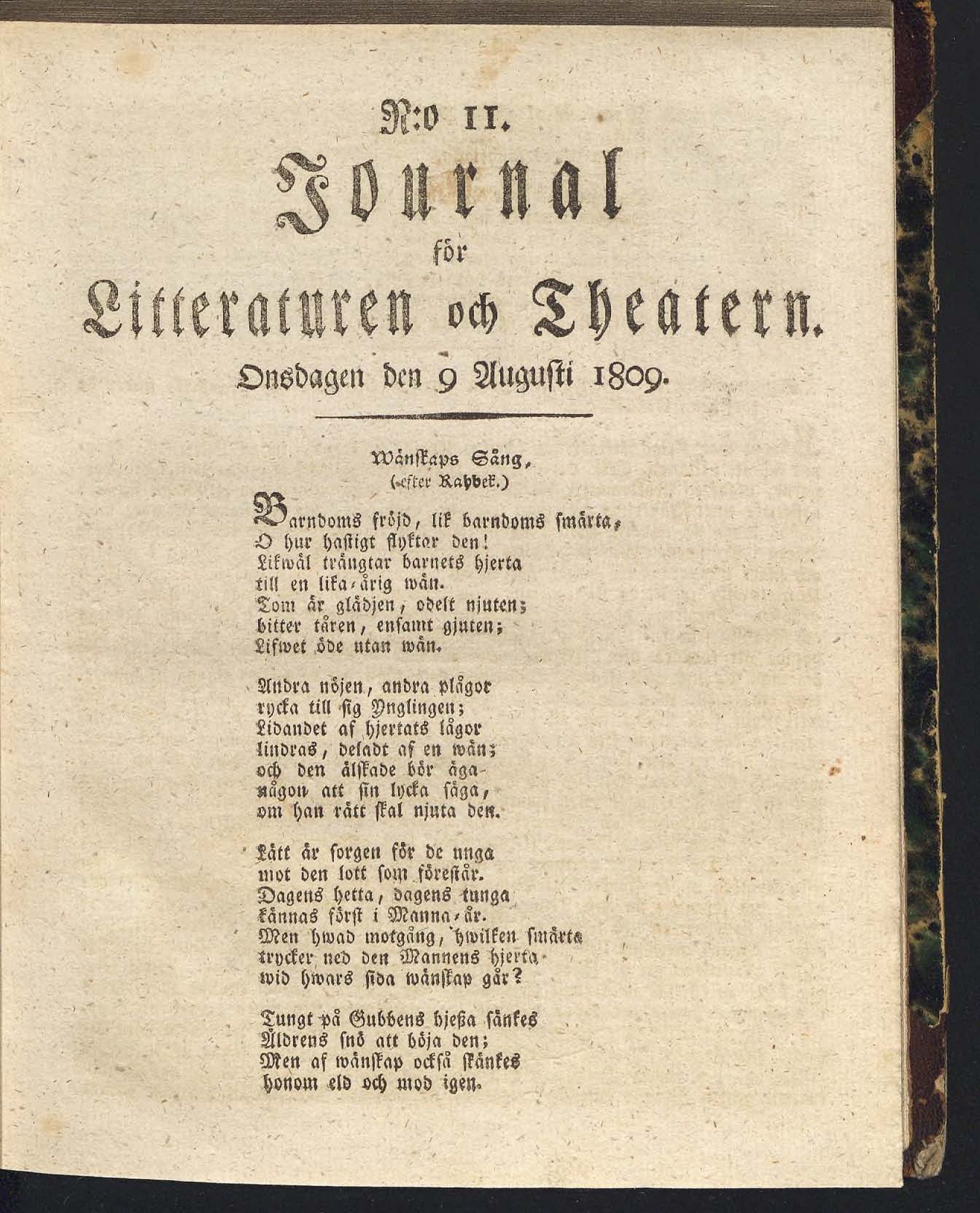 Full resolution (JPEG) - On this page / på denna sida - N:o 11. Onsdagen den 9 Augusti 1809 - Wänskaps Sång