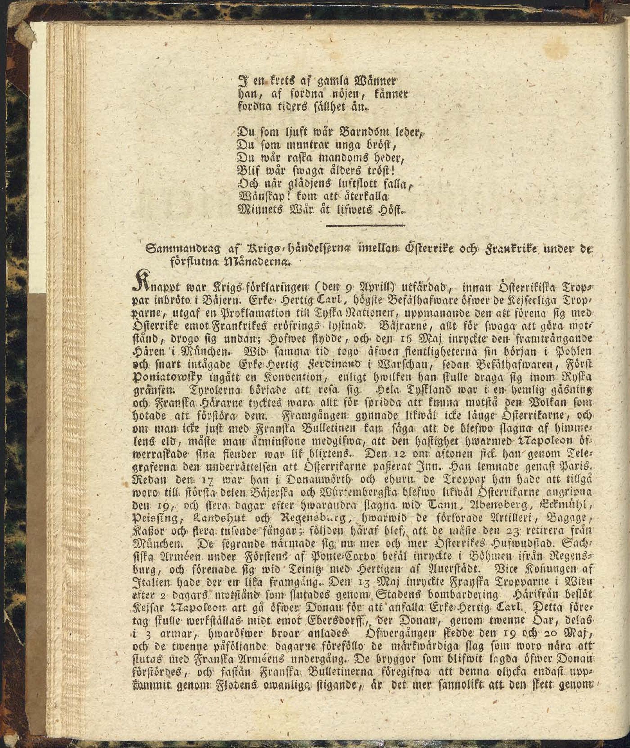 Full resolution (JPEG) - On this page / på denna sida - N:o 11. Onsdagen den 9 Augusti 1809 - Wänskaps Sång - Sammandrag af Krigs-händelserna imellan Österrike och Frankrike under de förflutna Månaderna