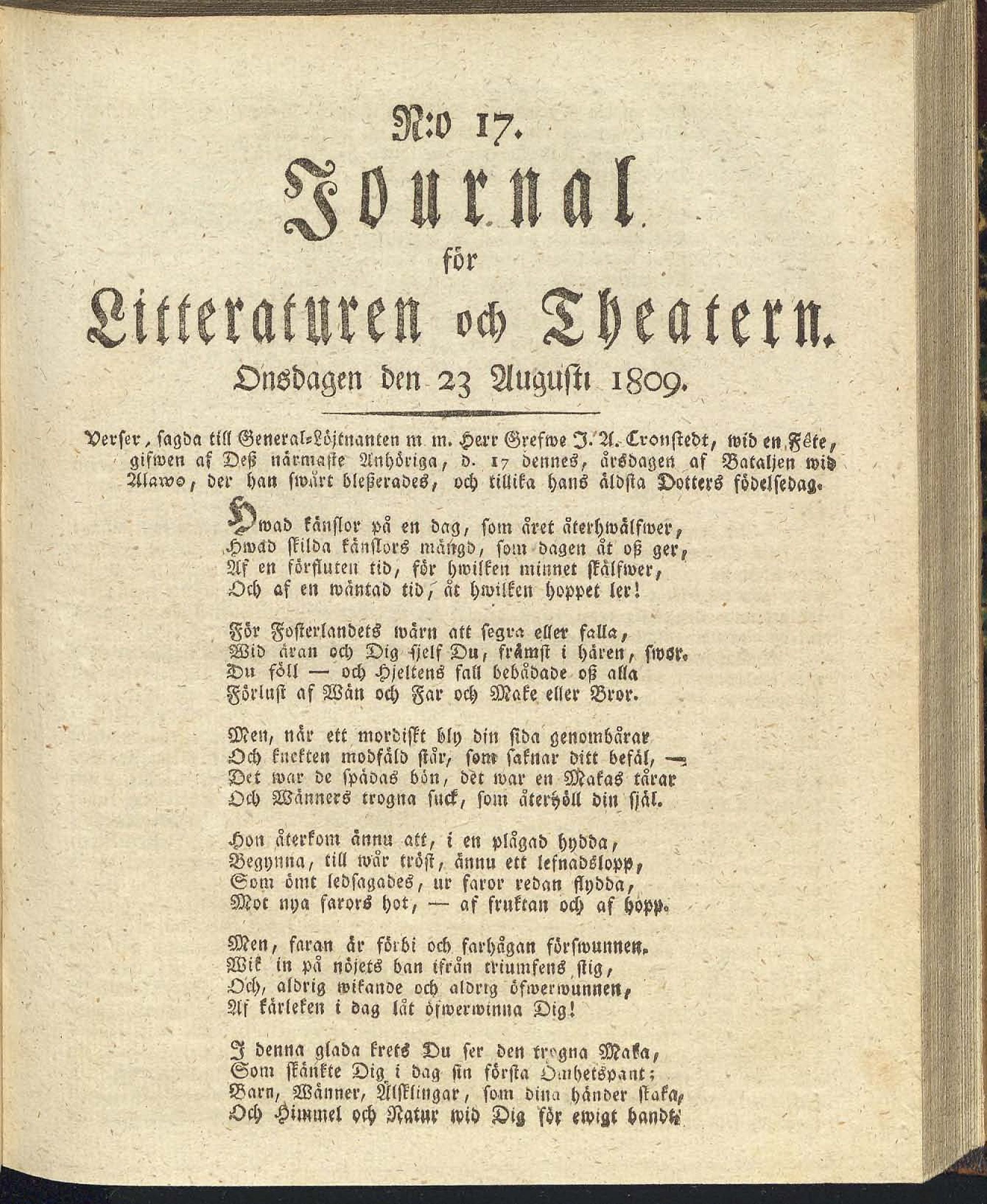 Full resolution (JPEG) - On this page / på denna sida - N:o 17. Onsdagen den 23 Augusti 1809 - Verser, sagda till General-Löjtnanten m. m. Herr Grefwe J. A. Cronstedt
