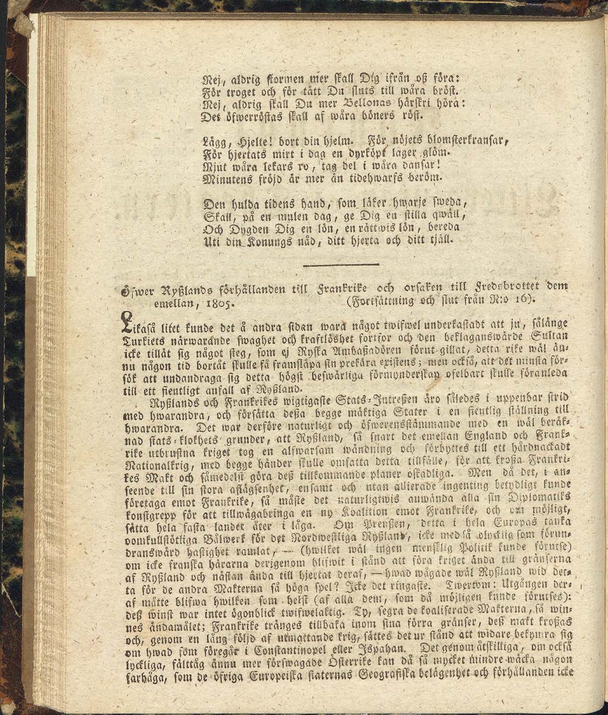 Full resolution (JPEG) - On this page / på denna sida - N:o 17. Onsdagen den 23 Augusti 1809 - Verser, sagda till General-Löjtnanten m. m. Herr Grefwe J. A. Cronstedt - Öfwer Rysslands förhållanden till Frankrike och orsaken till Fredsbrottet dem emellan, 1805. Fortsättning