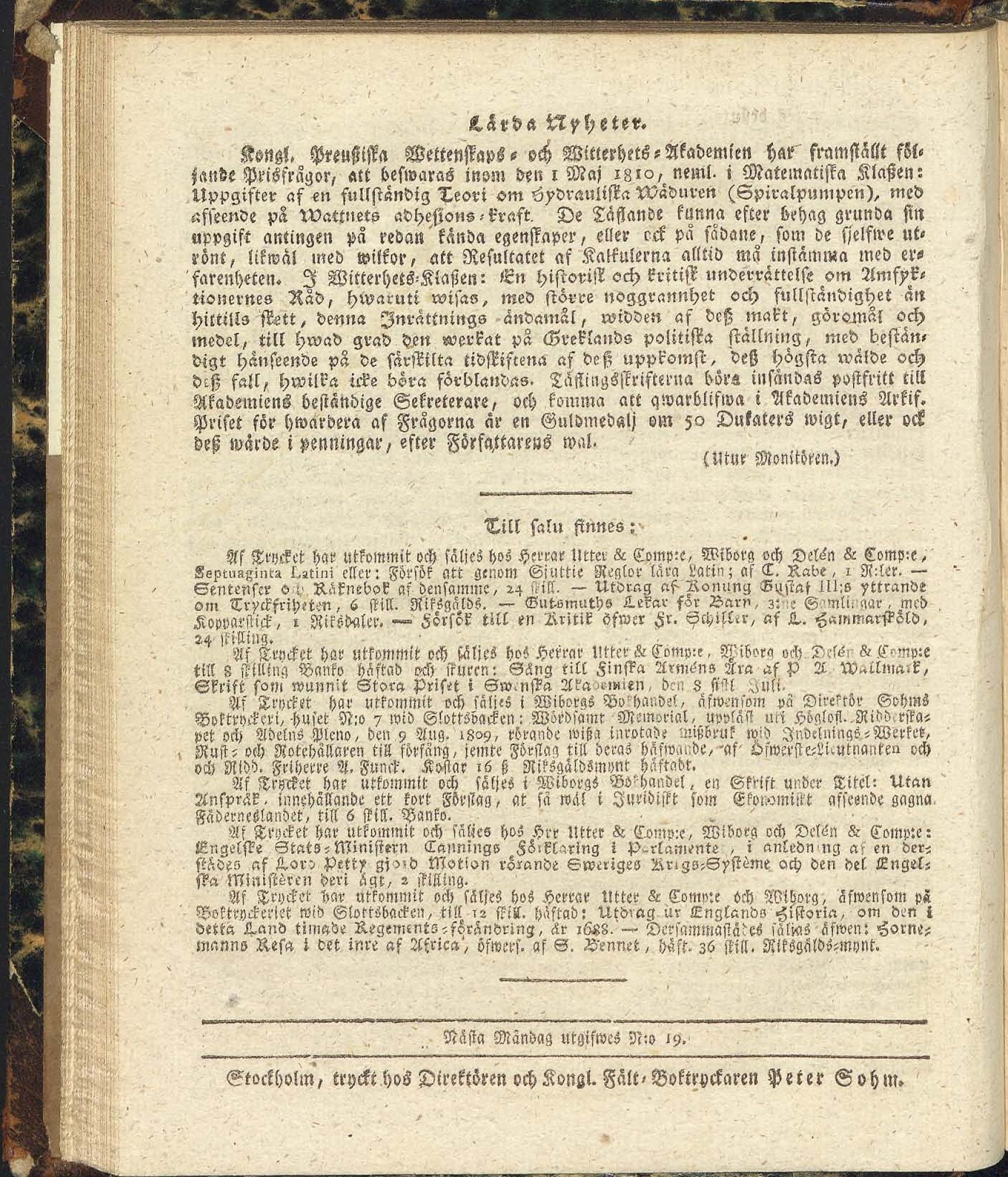 Full resolution (JPEG) - On this page / på denna sida - N:o 18. Fredagen den 25 Augusti 1809 - Lärda Nyheter - Till salu finnes