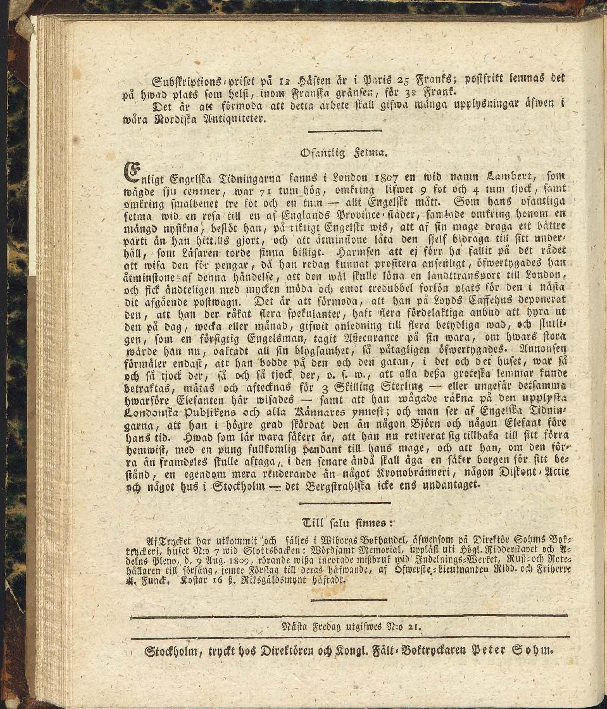 Full resolution (JPEG) - On this page / på denna sida - N:o 20. Onsdagen den 30 Augusti 1809 - Lärda Nyheter - Ofantlig Fetma - Till salu finnes