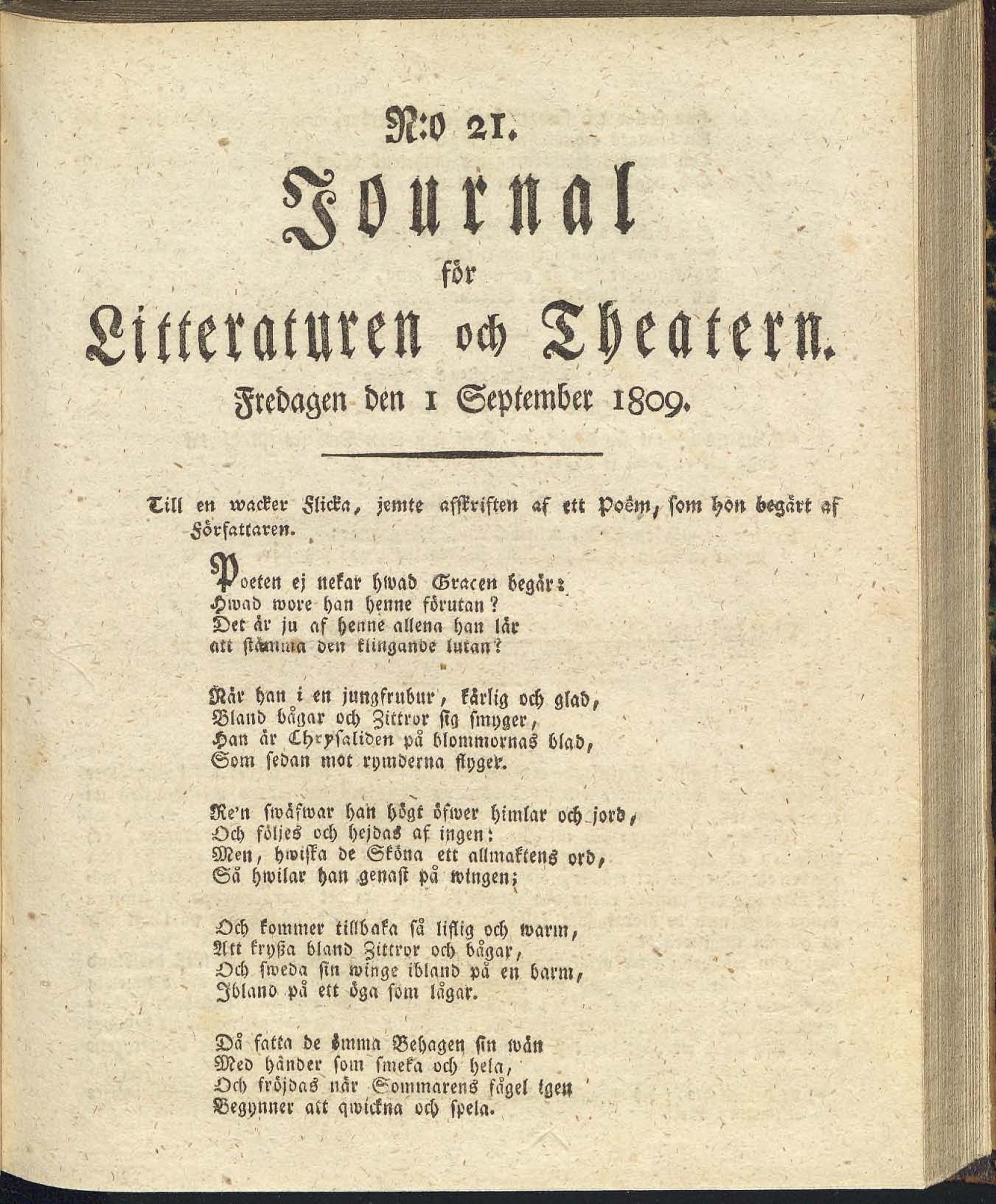 Full resolution (JPEG) - On this page / på denna sida - N:o 21. Fredagen den 1 September 1809 - Till en wacker Flicka