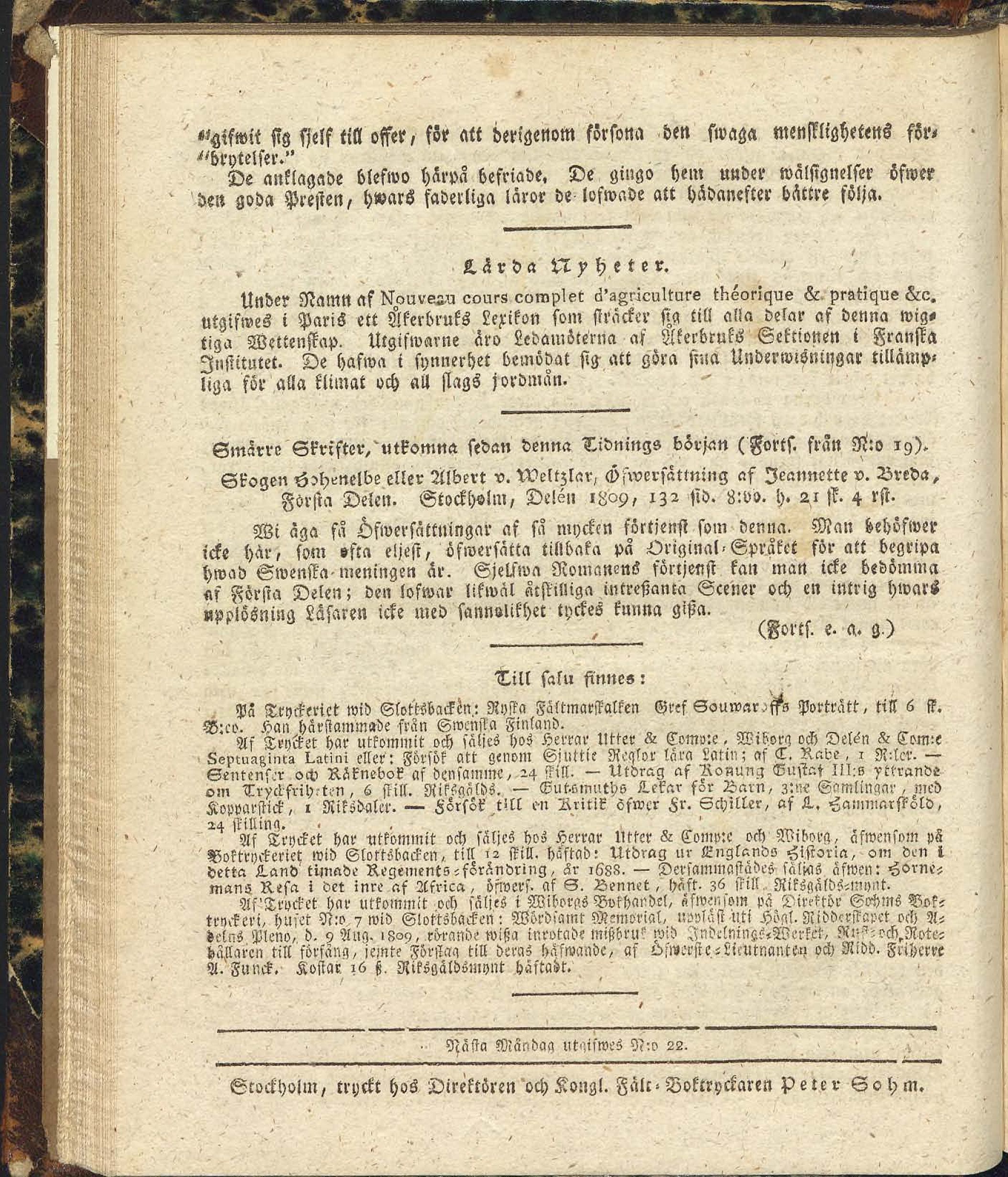 Full resolution (JPEG) - On this page / på denna sida - N:o 21. Fredagen den 1 September 1809 - Drag af en Katolsk Prest - Lärda Nyheter - Smärre Skrifter, utkomna sedan denna Tidnings början. Fortsättning - Till salu finnes