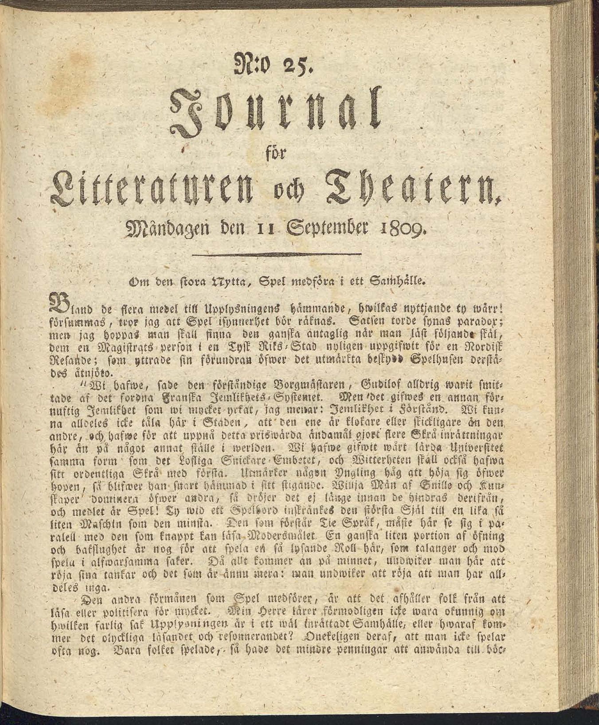 Full resolution (JPEG) - On this page / på denna sida - N:o 25. Måndagen den 11 September 1809 - Om den stora Nytta, Spel medföra i ett Samhälle