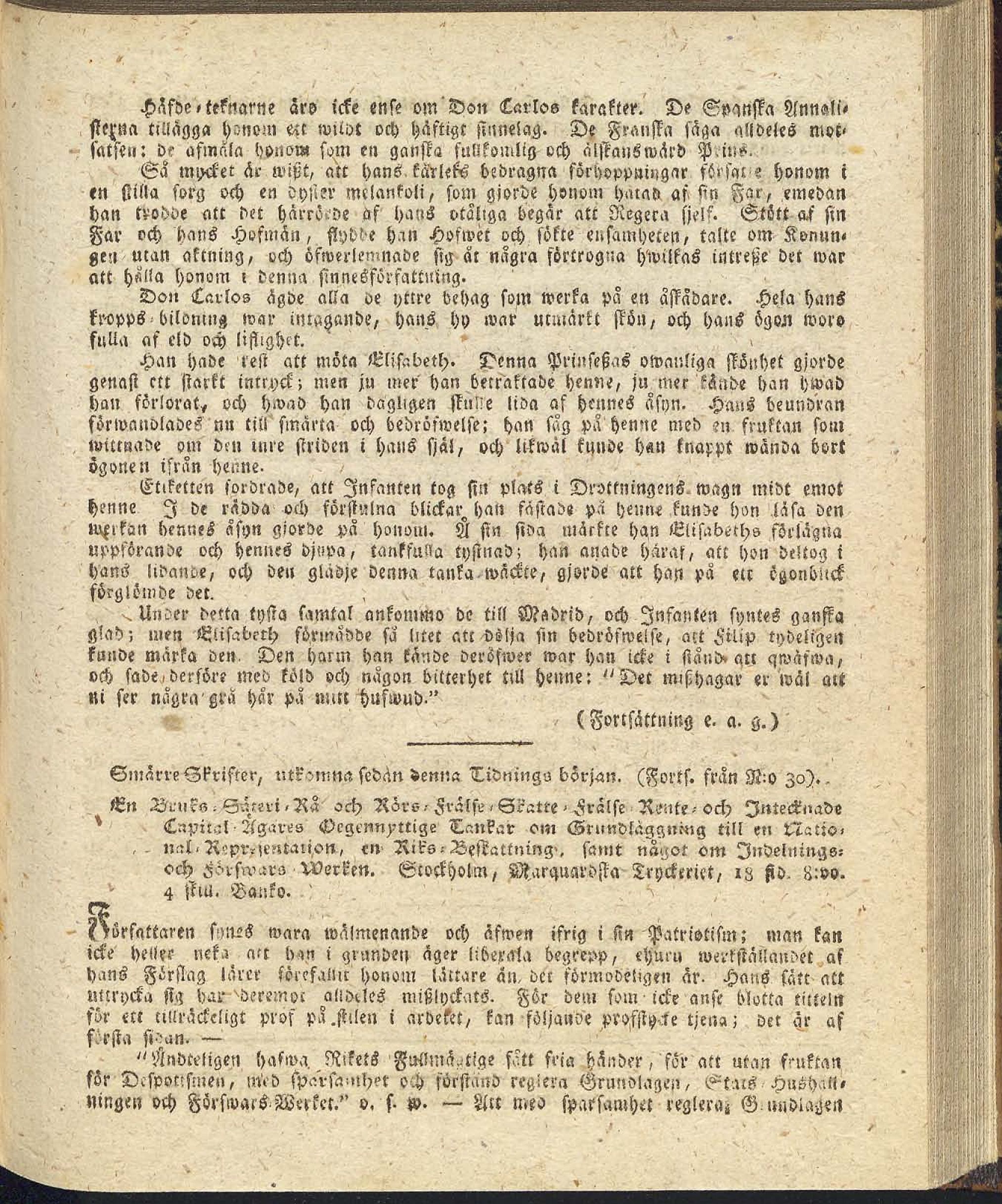 Full resolution (JPEG) - On this page / på denna sida - N:o 31. Måndagen den 25 September 1809 - Spanska Drottningen Elisabeth - Smärre Skrifter, utkomna sedan denna Tidnings början. Fortsättning