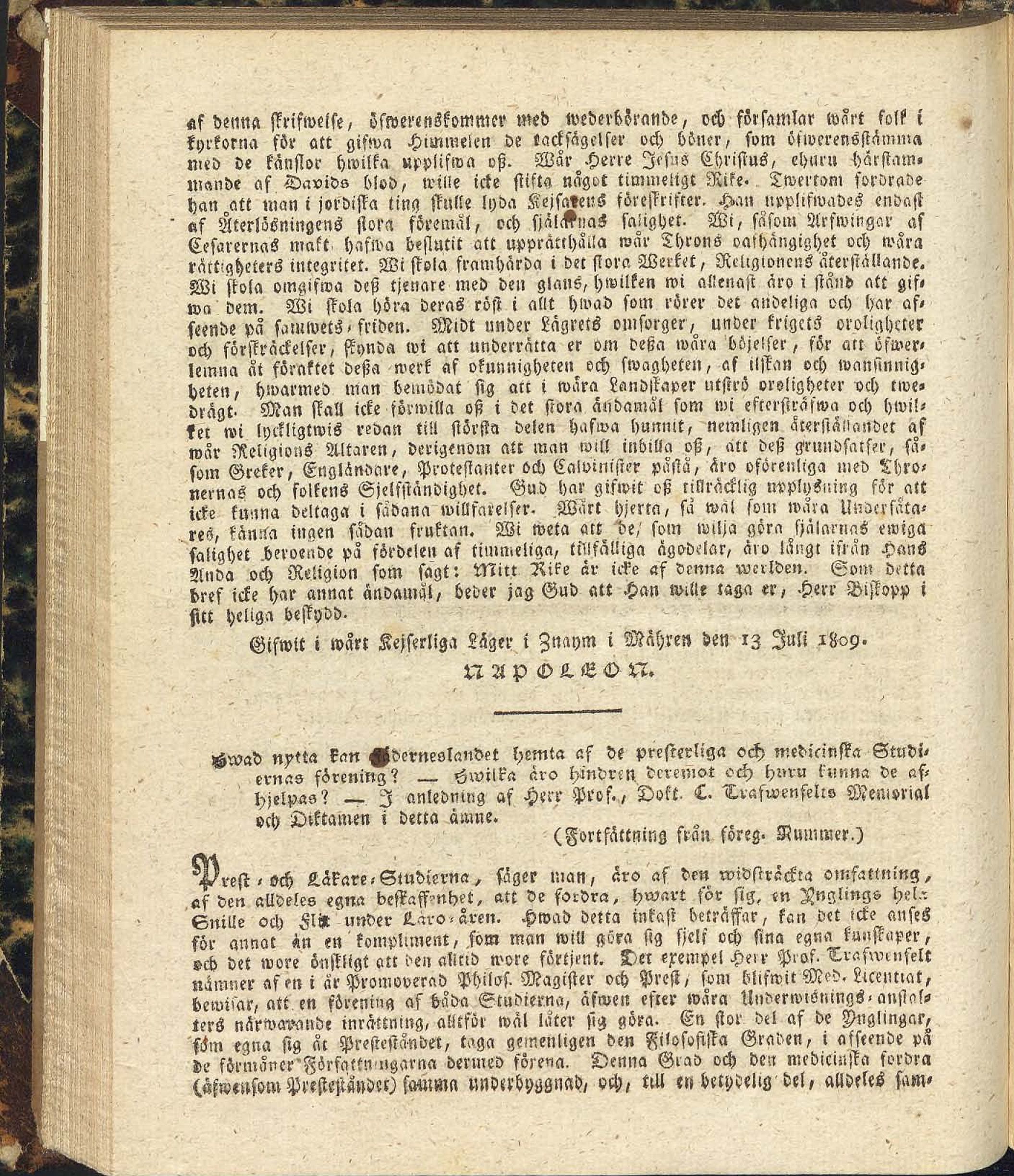 Full resolution (JPEG) - On this page / på denna sida - N:o 34. Måndagen den 2 Oktober 1809 - Stats-Papper. Följande Cirkulär har ifrån Kejsar Napoleon afgått till Biskopparna - Hwad nytta kan Fäderneslandet hemta af de presterliga och medicinska Studiernas förening? Fortsättning