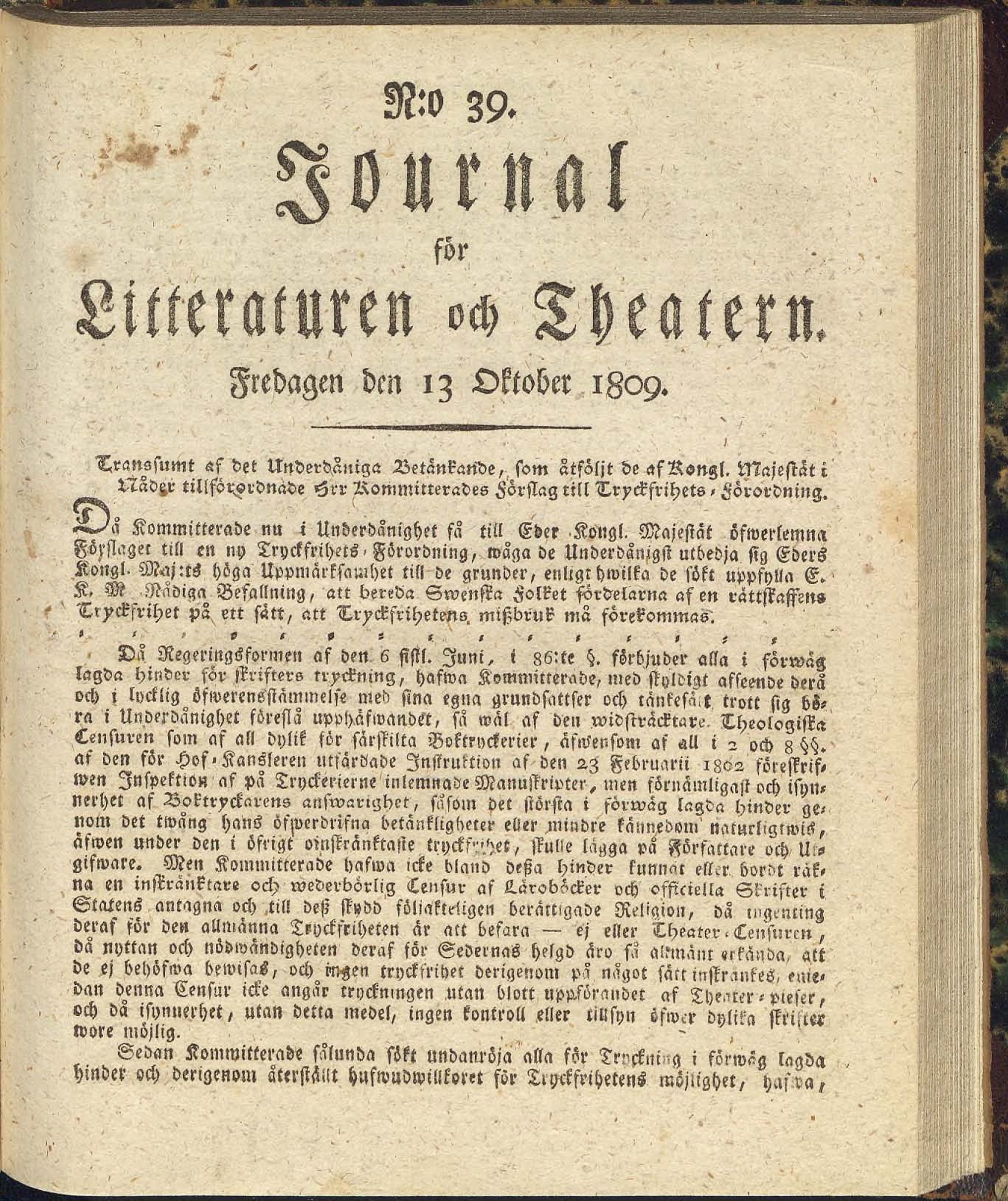 Full resolution (JPEG) - On this page / på denna sida - N:o 39. Fredagen den 13 Oktober 1809 - Transsumt af det Underdåniga Betänkande, som åtföljt de af Kongl. Majestät i Nåder tillförordnade Hrr Kommitterades Förslag till Tryckfrihets-Förordning