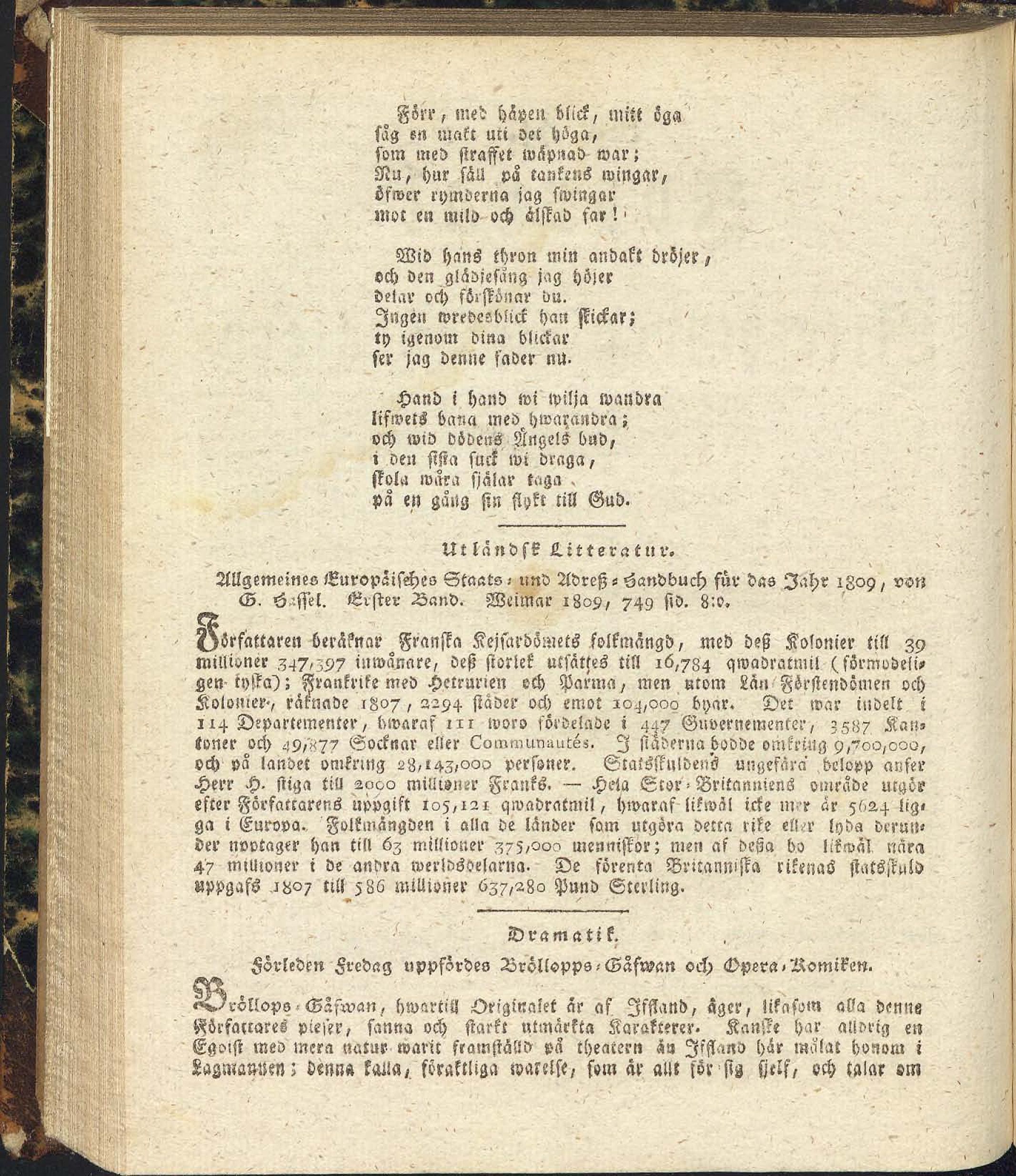 Full resolution (JPEG) - On this page / på denna sida - N:o 44. Onsdagen den 25 Oktober 1809 - Till Malvina, efter Baggesen - Utländsk Litteratur - Dramatik