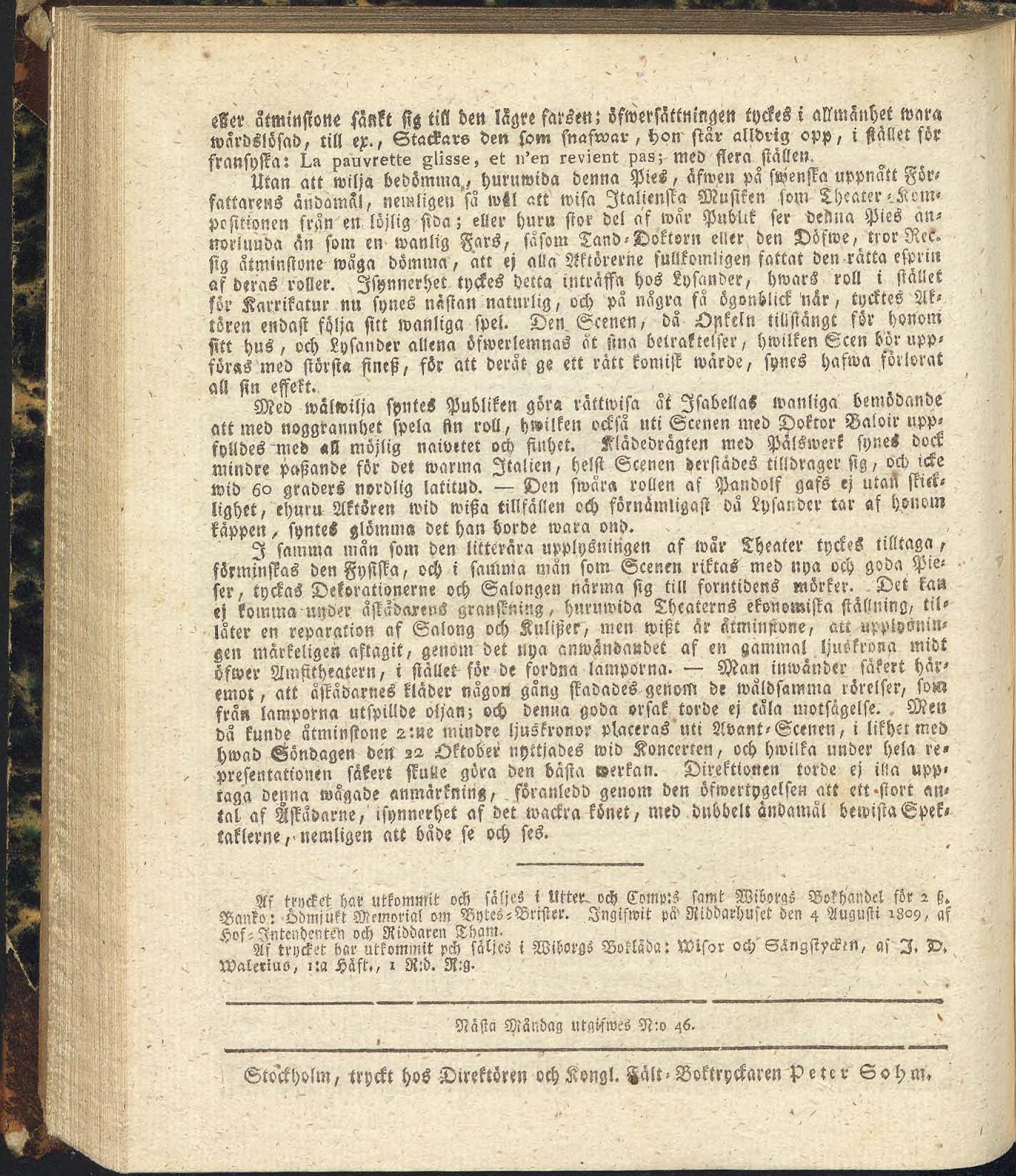 Full resolution (JPEG) - On this page / på denna sida - N:o 45. Fredagen den 27 Oktober 1809 - Dramatik - Af trycket har utkommit