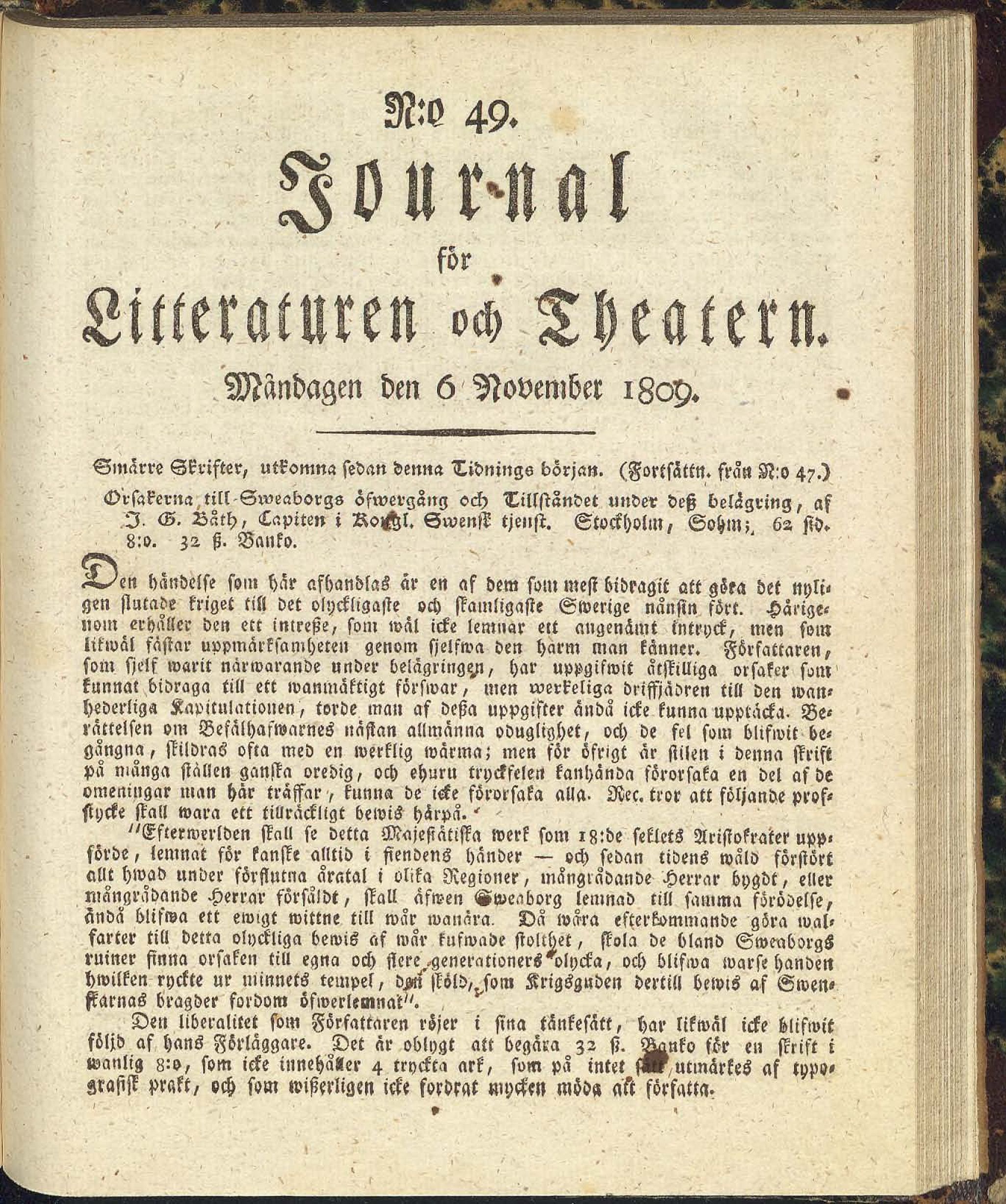 Full resolution (JPEG) - On this page / på denna sida - N:o 49. Måndagen den 6 November 1809 - Smärre Skrifter, utkomna sedan denna Tidnings början. Fortsättning