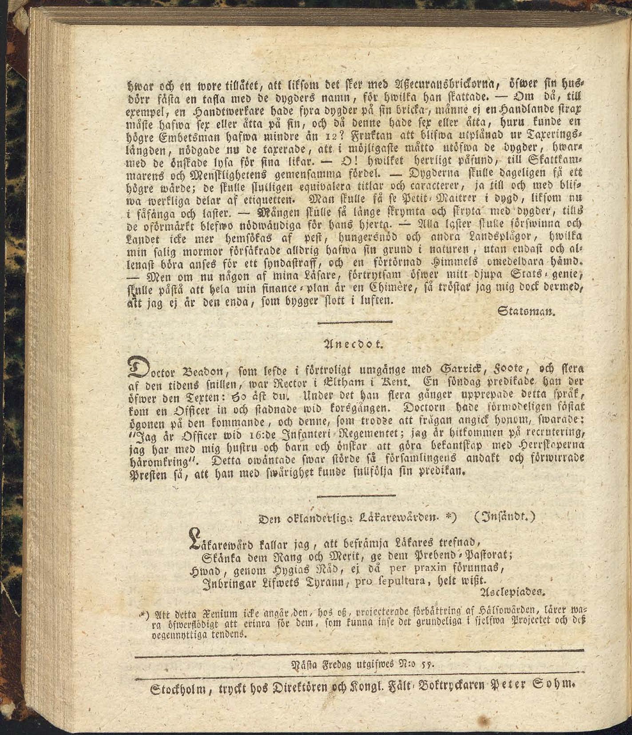 Full resolution (JPEG) - On this page / på denna sida - N:o 54. Onsdagen den 15 November 1809 - Förslag till en alldeles ny Bewillning - Anecdot - Den oklanderliga Läkarewården. Insändt