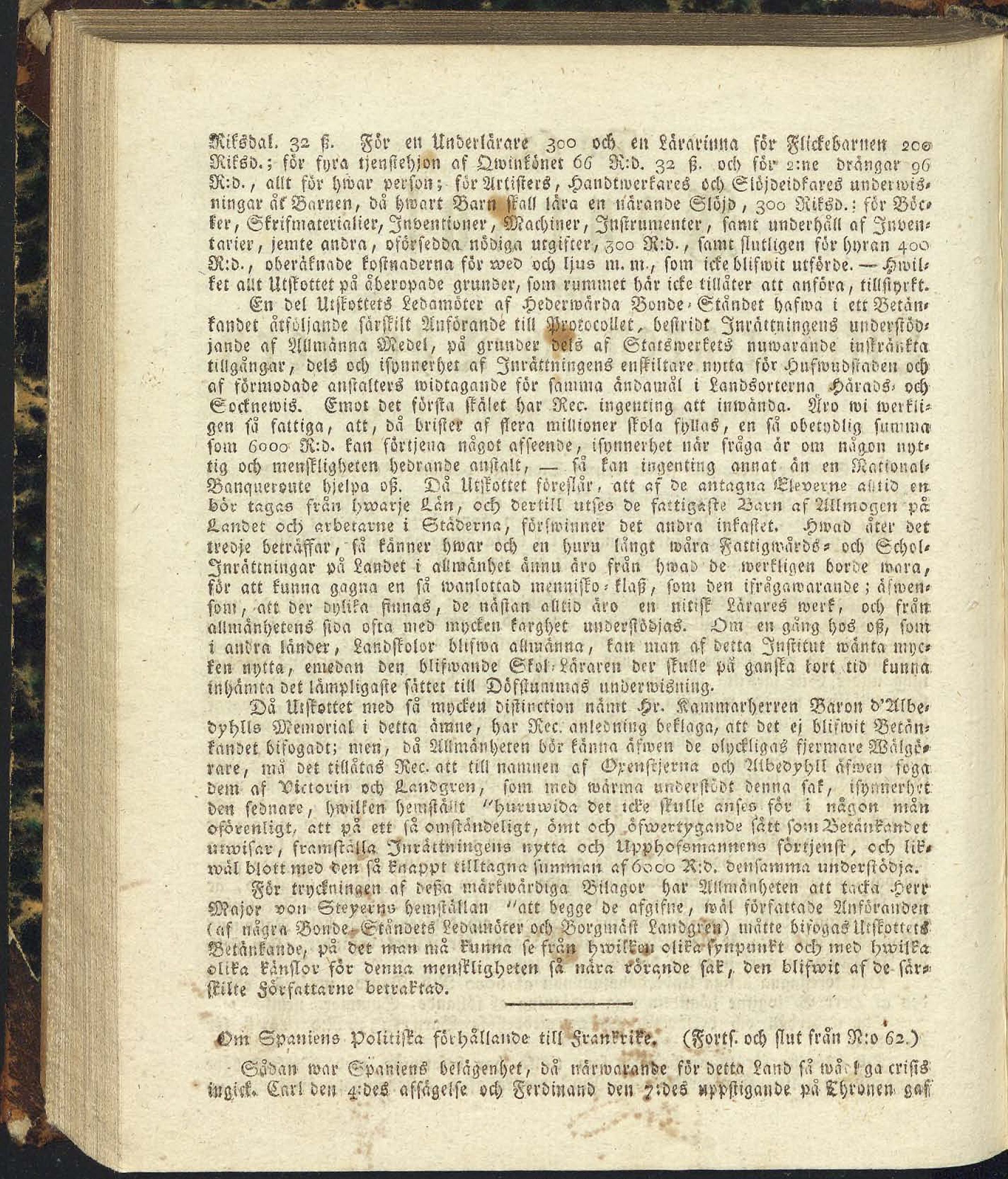 Full resolution (JPEG) - On this page / på denna sida - N:o 63. Fredagen den 1 December 1809 - Smärre Skrifter, utkomna sedan denna Tidnings början. Fortsättning - Om Spaniens Politiska förhållande till Frankrike. Fortsättning och slut