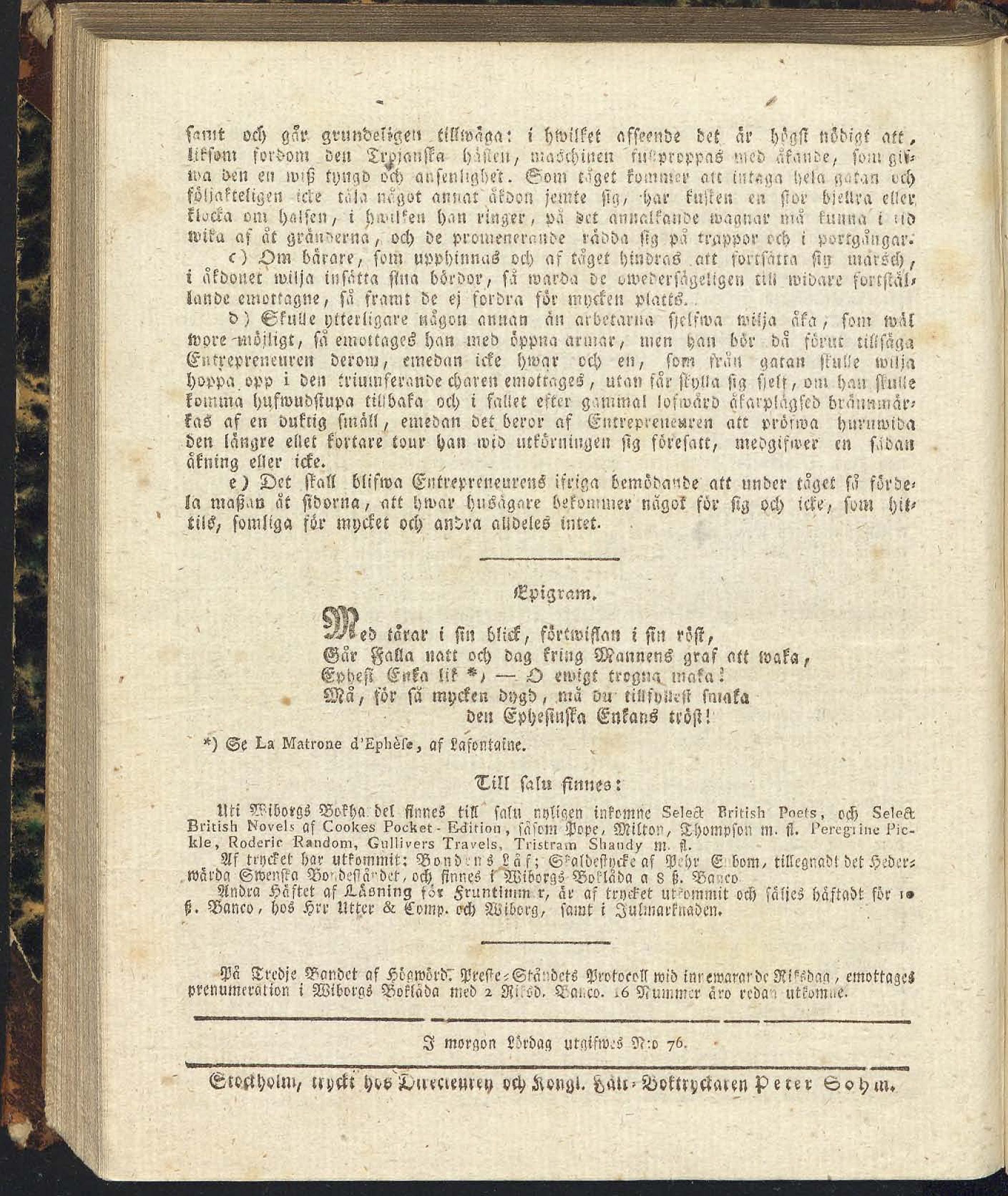 Full resolution (JPEG) - On this page / på denna sida - N:o 75. Fredagen den 22 December 1809 - Något om Gaturenhållningen. Insändt - Epigram - Till salu finnes - På Tredje Bandet af Högwörd. Preste-Ståndets Protocoll