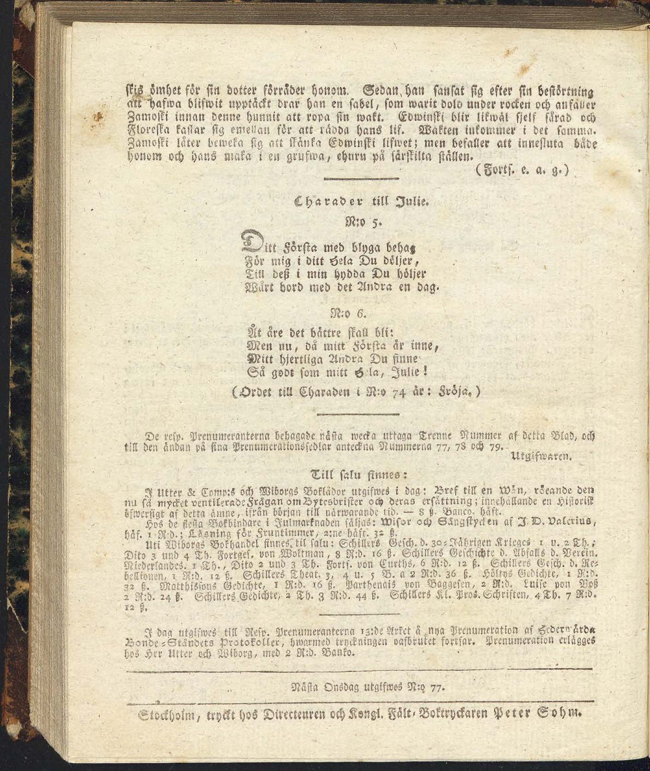 Full resolution (JPEG) - On this page / på denna sida - N:o 76. Lördagen den 23 December 1809 - Dramatik - Charader till Julie - De resp. Prenumeranterna behagade - Till salu finnes - I dag utgifwes till Resp. Prenumeranterna