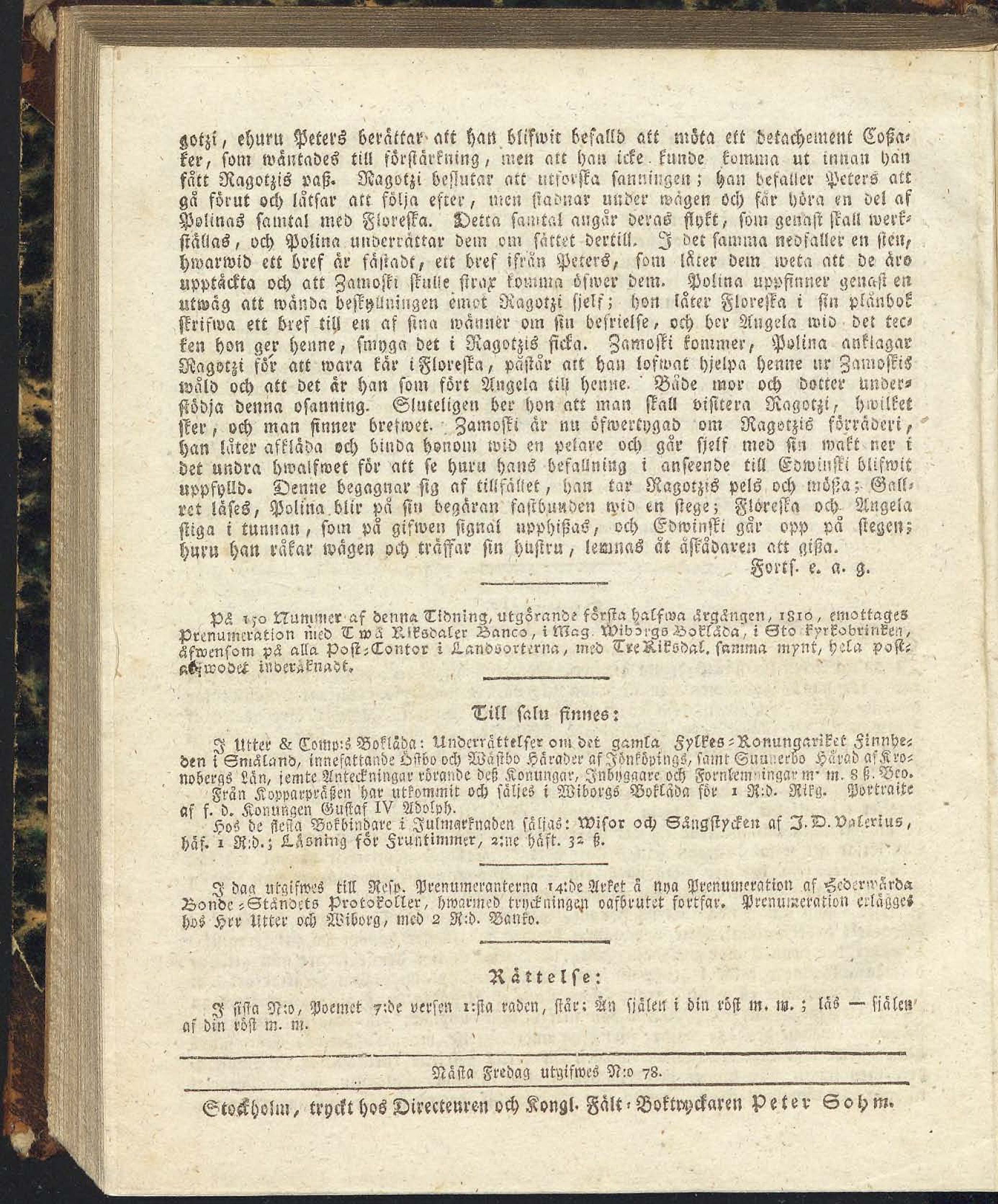 Full resolution (JPEG) - On this page / på denna sida - N:o 77. Onsdagen den 27 December 1809 - Dramatik - På 150 Nummer af denna Tidning - Till salu finnes - I dag utgifwes till Resp. Prenumeranterna - Rättelse