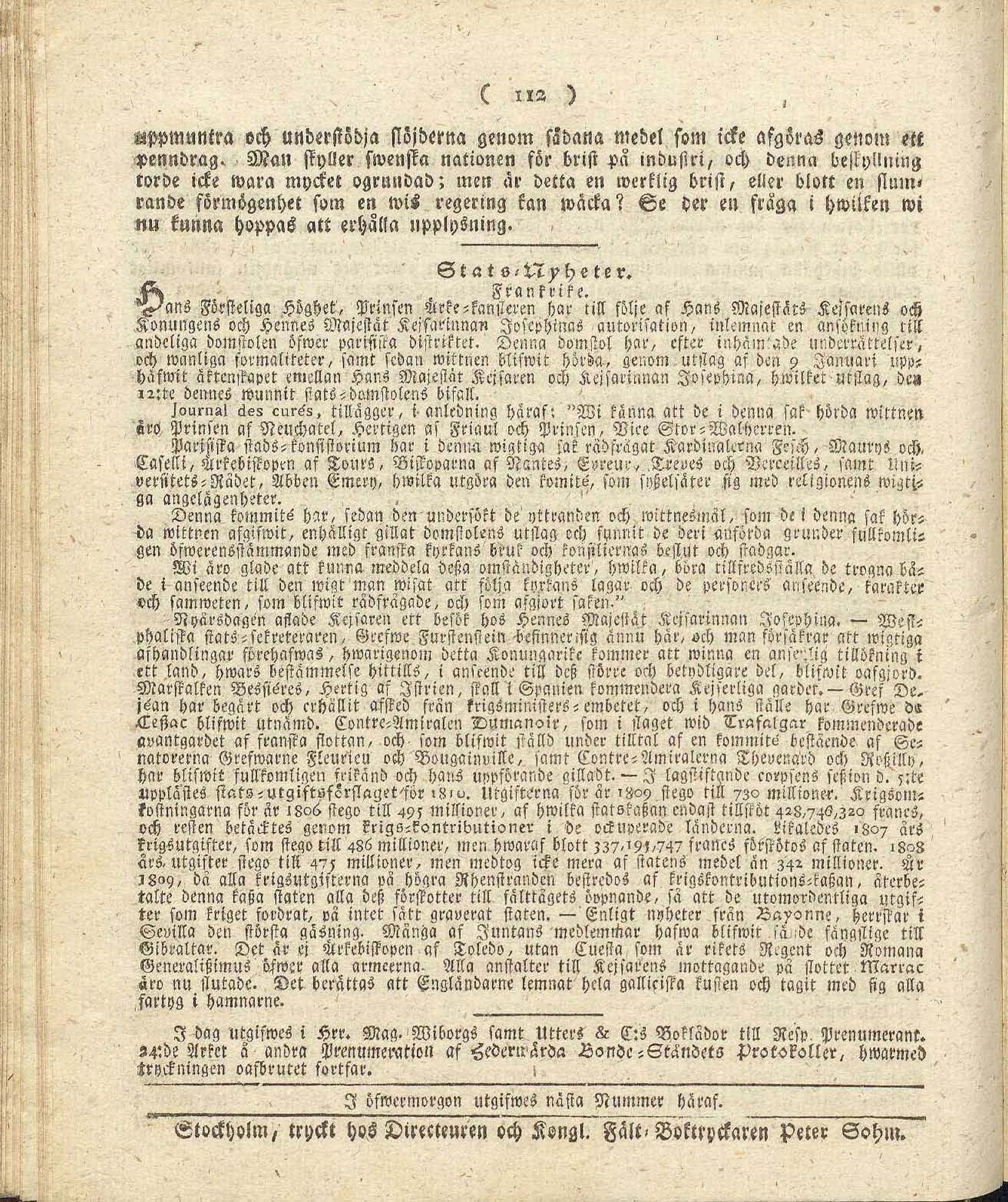 Full resolution (JPEG) - On this page / på denna sida - N:o 28. Lördagen den 3 Februari 1810 - Strö-Skrifter - Stats-Nyheter - I dag utgifwes