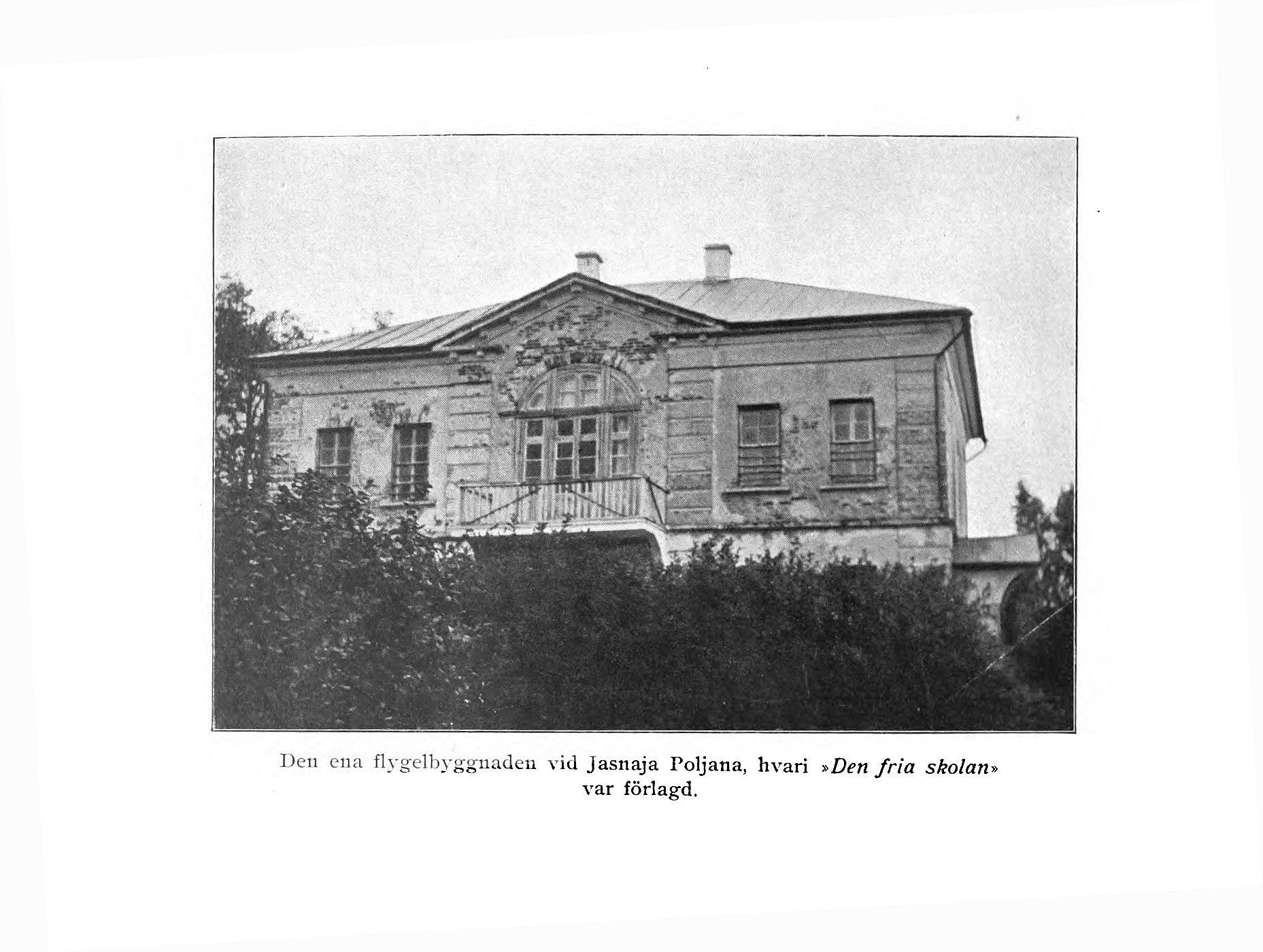 | Den ena flygelbyggnaden vid Jasnaja Poljana, hvari »Den fria skolan» var förlagd. |