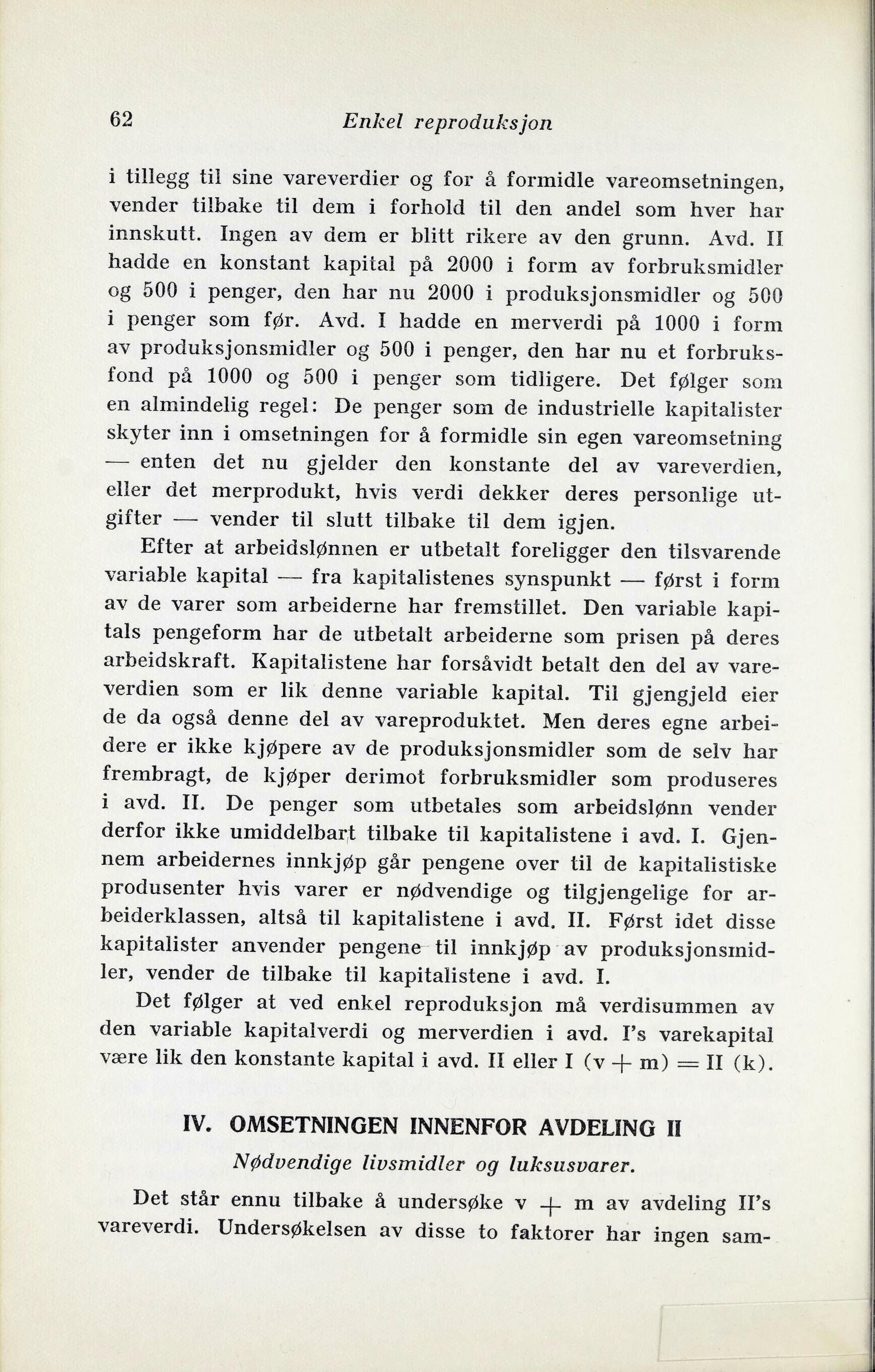Full resolution (JPEG) - On this page / på denna sida - 3. Reproduksjon og omsetning av samfundets samlede kapital - 20. Enkel reproduksjon - III. Omsetningen mellem de to avdelinger. Bytte av (v + m) fra avd. I med k fra avd. II - IV. Omsetningen innenfor avdeling II. Nødvendige livsmidler og luksusvarer
