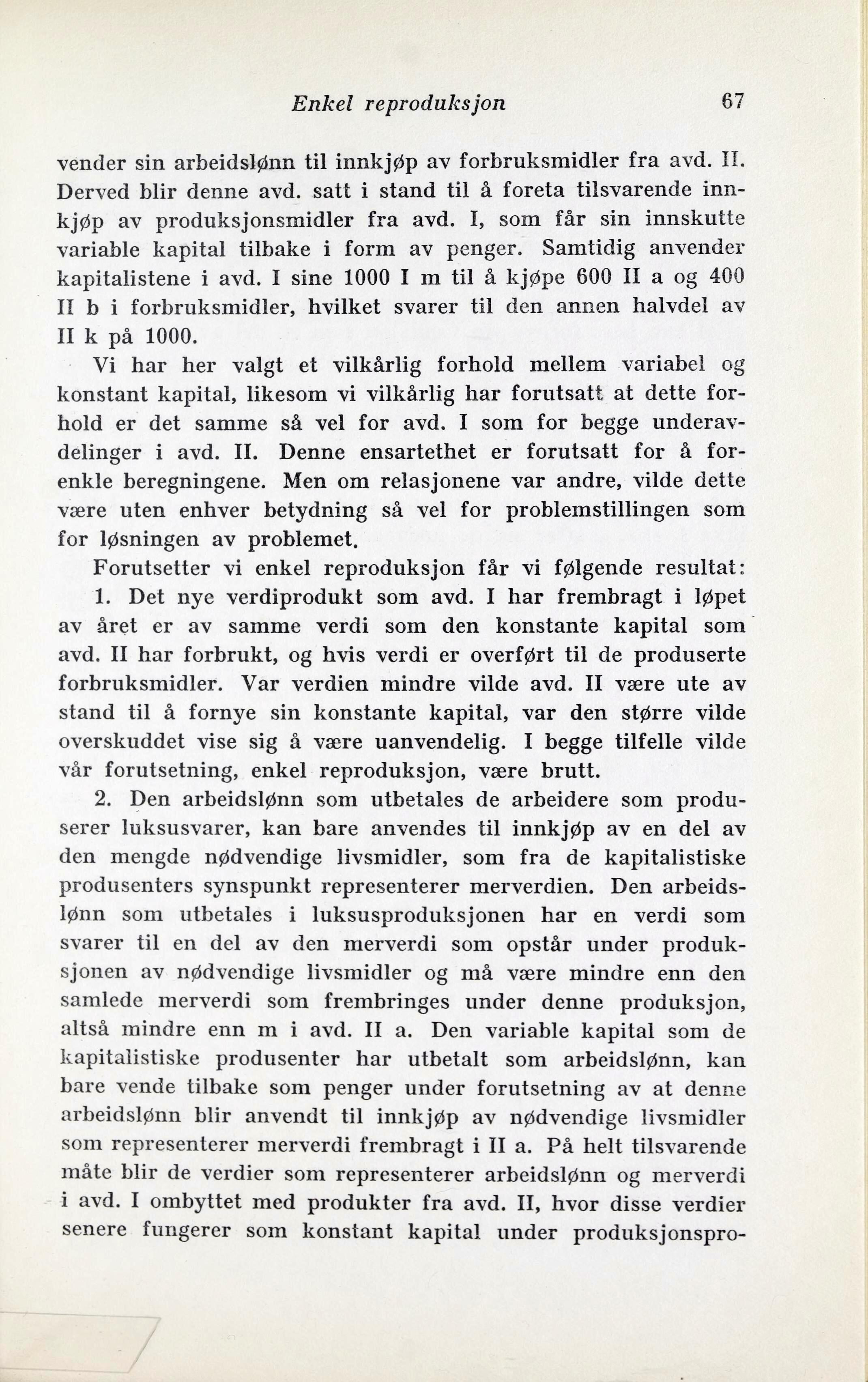Forutsetter vi enkel reproduksjon får vi følgende resultat: