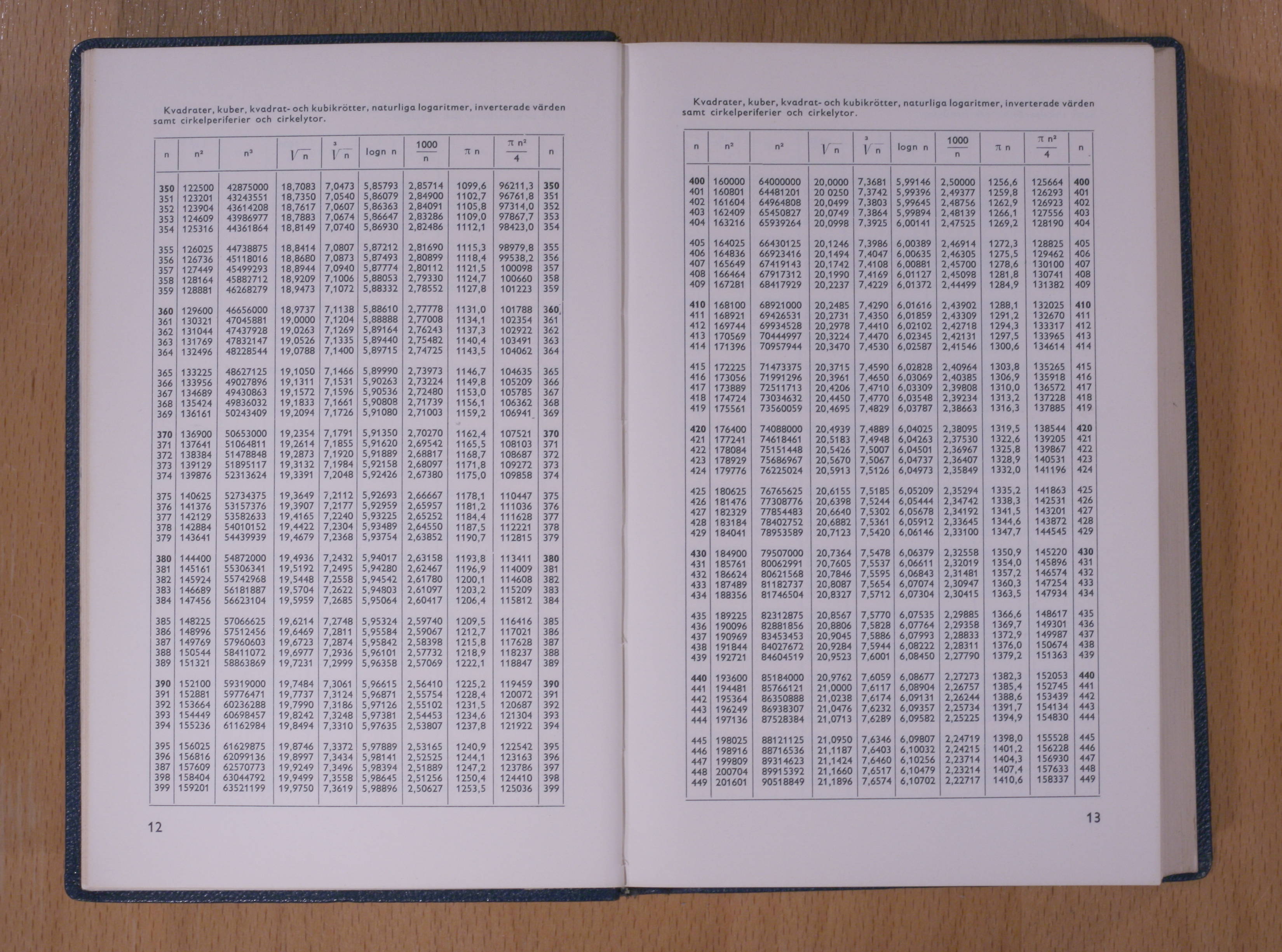 Full resolution (JPEG) - On this page / på denna sida - 1. Matematik - Kvadrater, kuber, kvadrat- och kubikrötter, naturliga logaritmer, inverterade värden samt cirkelperiferier och cirkelytor - Hela tal 350-449