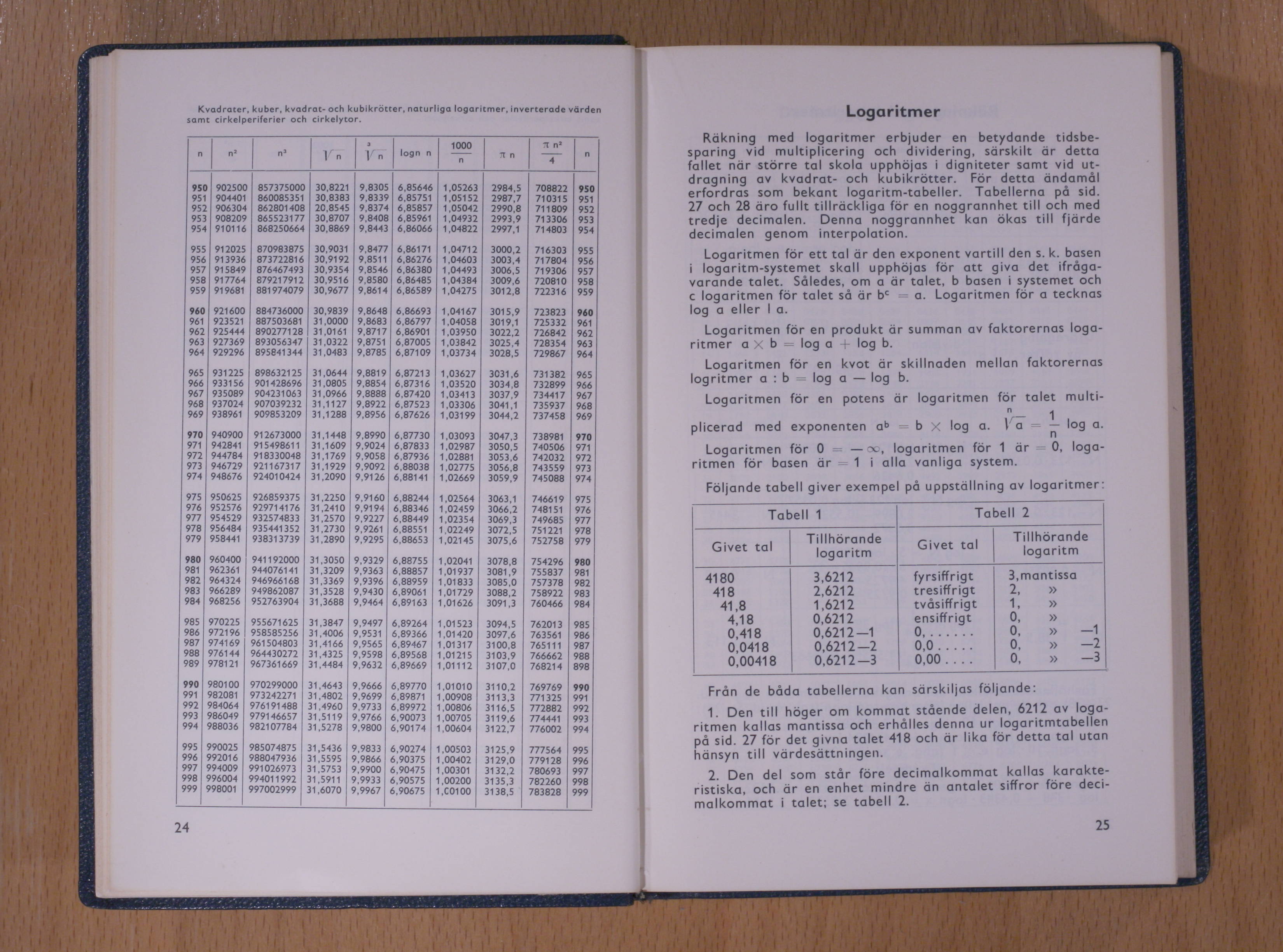 Full resolution (JPEG) - On this page / på denna sida - 1. Matematik - Kvadrater, kuber, kvadrat- och kubikrötter, naturliga logaritmer, inverterade värden samt cirkelperiferier och cirkelytor - Hela tal 950-999 - Logaritmer