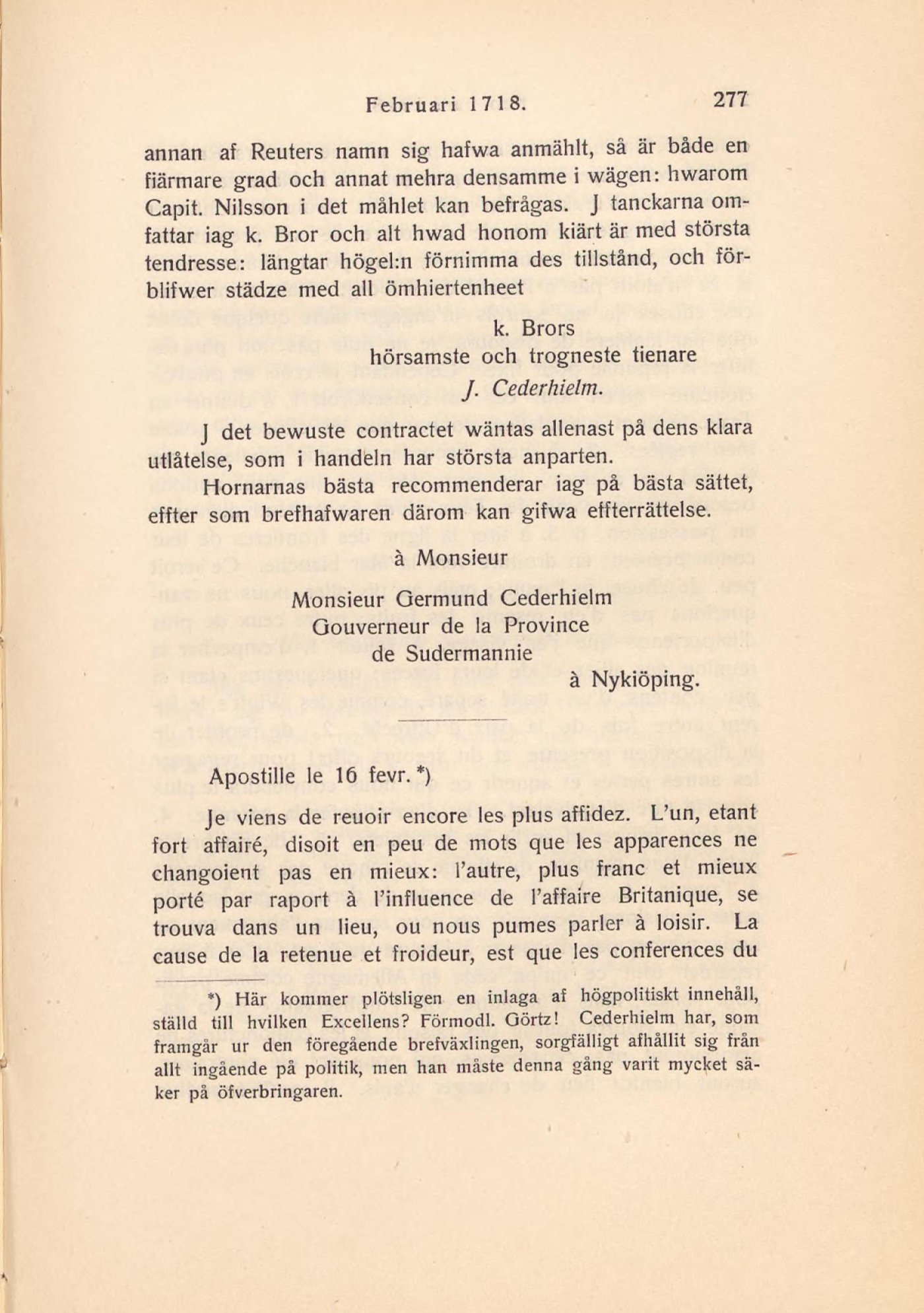 ställd till hvilken Excellens? Förmodl. Görtz! Cederhielm har, som