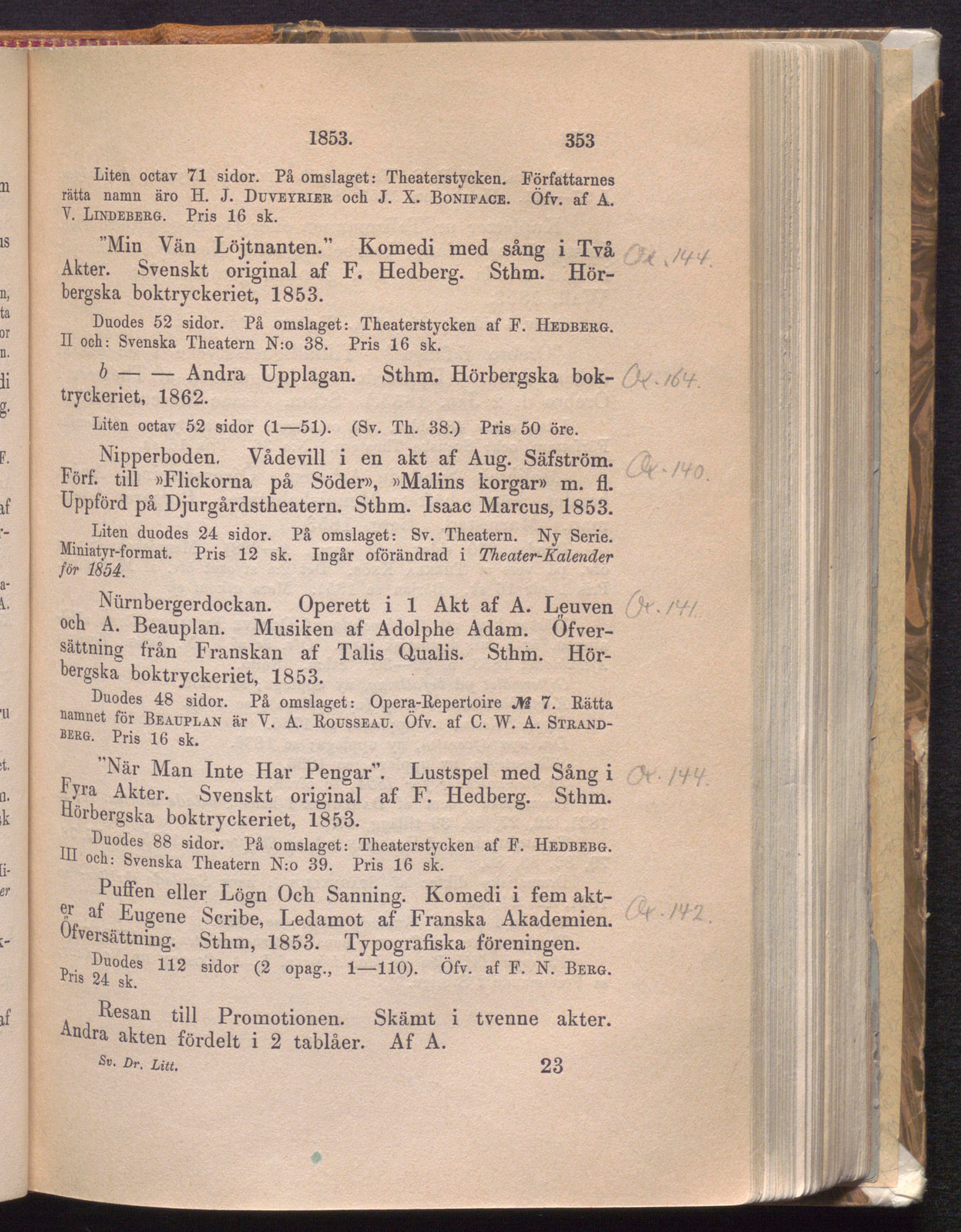Duodes 52 sidor. På omslaget: Theaterstycken af P. Hedberg.