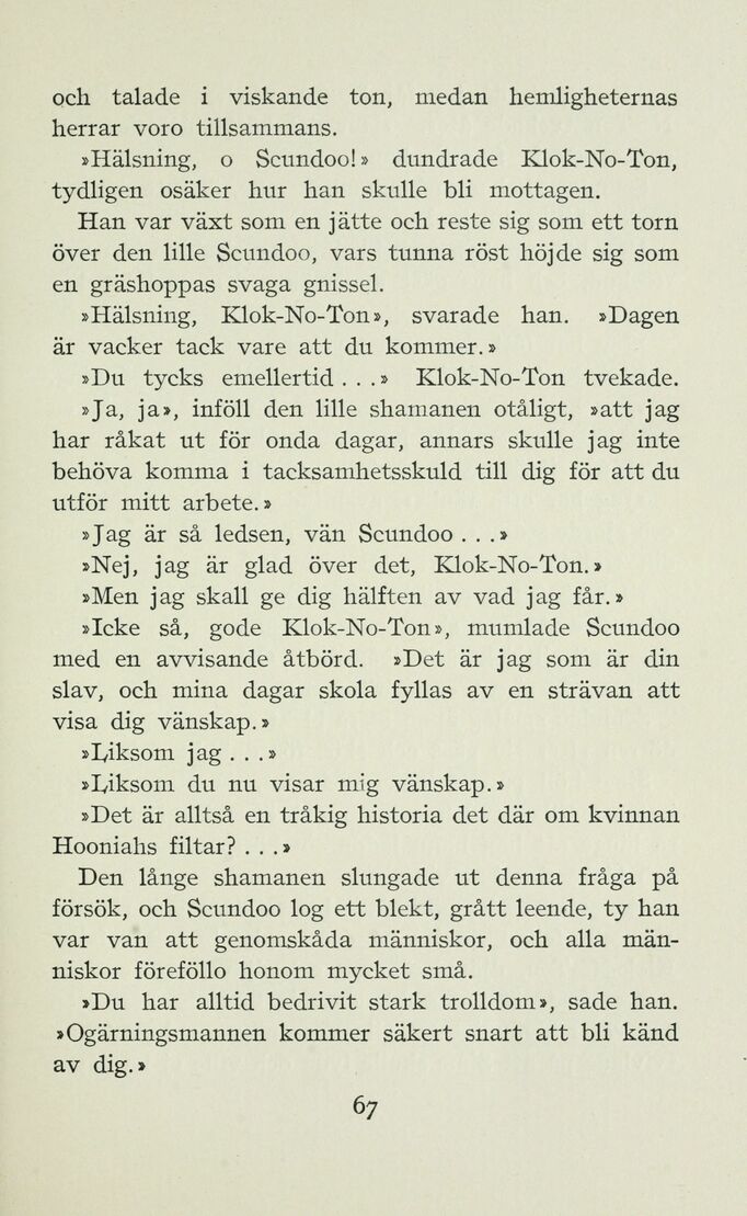 »Icke så, gode Klok-No-Ton», mumlade Scundoo med en avvisande åtbörd. »Det är jag som är din slav, och mina dagar skola fyllas av en strävan att visa dig vänskap.»