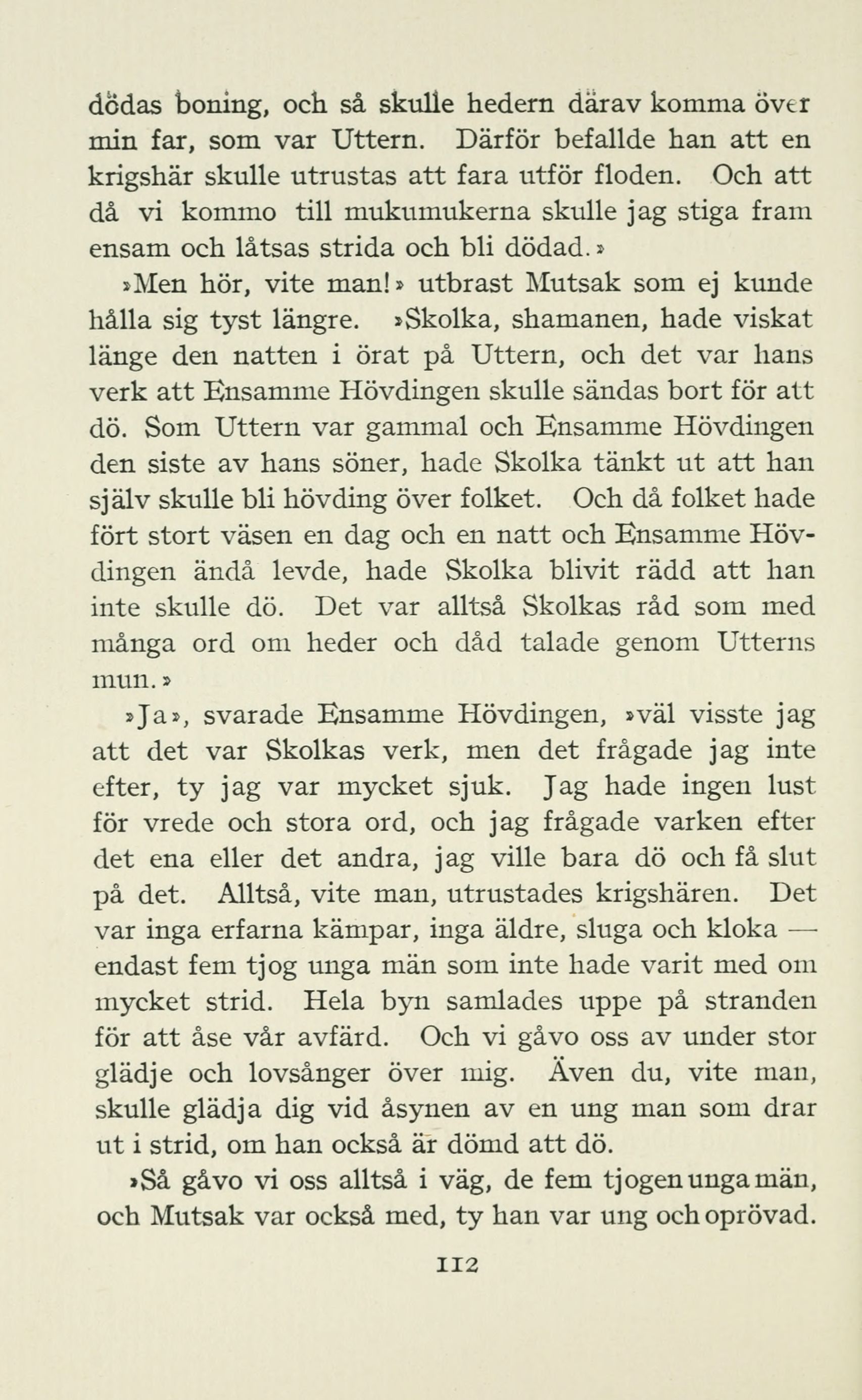 »Men hör, vite man!» utbrast Mutsak som ej kunde hålla sig tyst längre. »Skolka, shamanen, hade viskat länge den natten i örat på Uttern, och det var hans verk att Ensamme Hövdingen skulle sändas bort för att dö. Som Uttern var gammal och Ensamme Hövdingen den siste av hans söner, hade Skolka tänkt ut att han själv skulle bli hövding över folket. Och då folket hade fört stort väsen en dag och en natt och Ensamme Hövdingen ändå levde, hade Skolka blivit rädd att han inte skulle dö. Det var alltså Skolkas råd som med många ord om heder och dåd talade genom Utterns mun.»