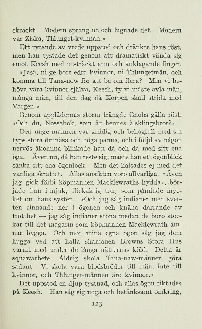 Den unge mannen var smidig och behagfull med sin typs stora örnnäsa och höga panna, och i följd av någon nervös åkomma blinkade han då och då med sitt ena öga. Även nu, då han reste sig, måste han ett ögonblick sänka sitt ena ögonlock. Men det hälsades ej med det vanliga skrattet. Allas ansikten voro allvarliga. » Även jag gick förbi köpmannen Macklewraths hydda», började han i mjuk, flickaktig ton, som påminde mycket om hans syster. »Och jag såg indianer med svetten rinnande ner i ögonen och knäna darrande av trötthet — jag såg indianer stöna medan de buro stockar till det magasin som köpmannen Macklewrath ämnar bygga. Och med mina egna ögon såg jag dem hugga ved att hålla shamanen Browns Stora Hus varmt med under de långa nätternas köld. Detta är squawarbete. Aldrig skola Tana-naw-männen göra sådant. Vi skola vara blodsbröder till män, inte till kvinnor, och Thlunget-männen äro kvinnor.»