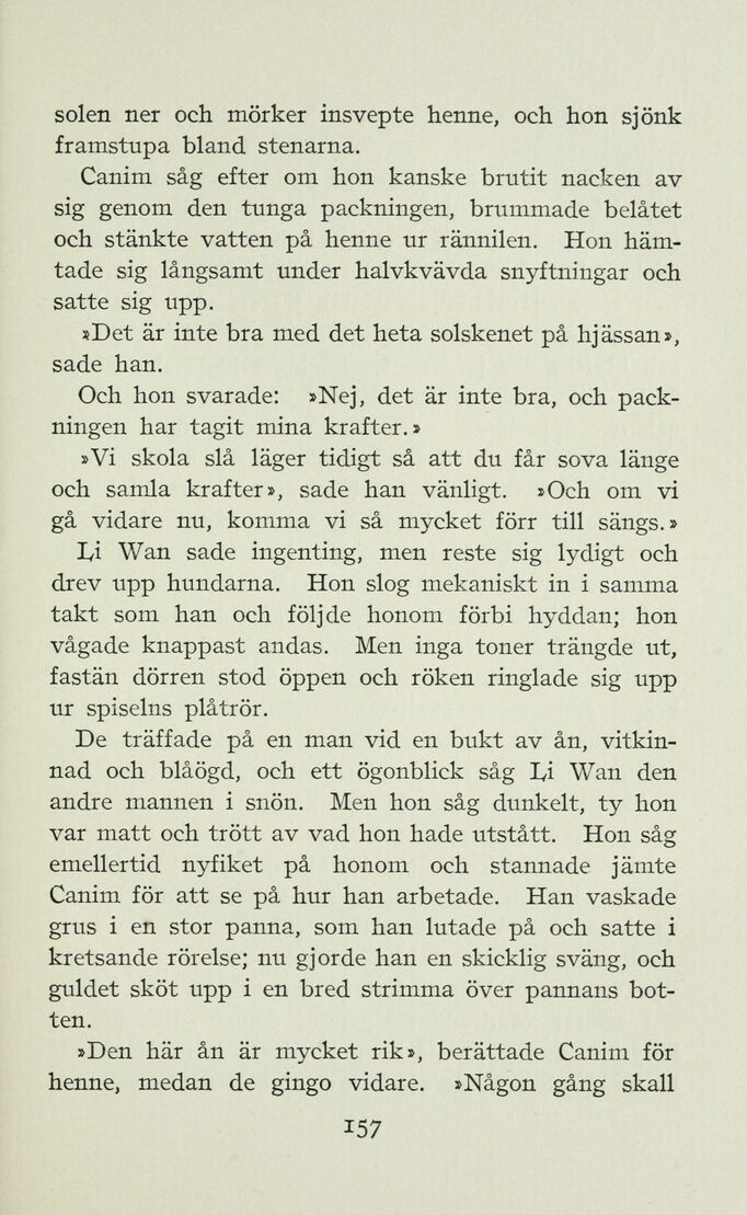 De träffade på en man vid en bukt av ån, vitkin-nad och blåögd, och ett ögonblick såg I/i Wan den andre mannen i snön. Men hon såg dunkelt, ty hon var matt och trött av vad hon hade utstått. Hon såg emellertid nyfiket på honom och stannade jämte Canim för att se på hur han arbetade. Han vaskade grus i en stor panna, som han lutade på och satte i kretsande rörelse; nu gjorde han en skicklig sväng, och guldet sköt upp i en bred strimma över pannans botten.