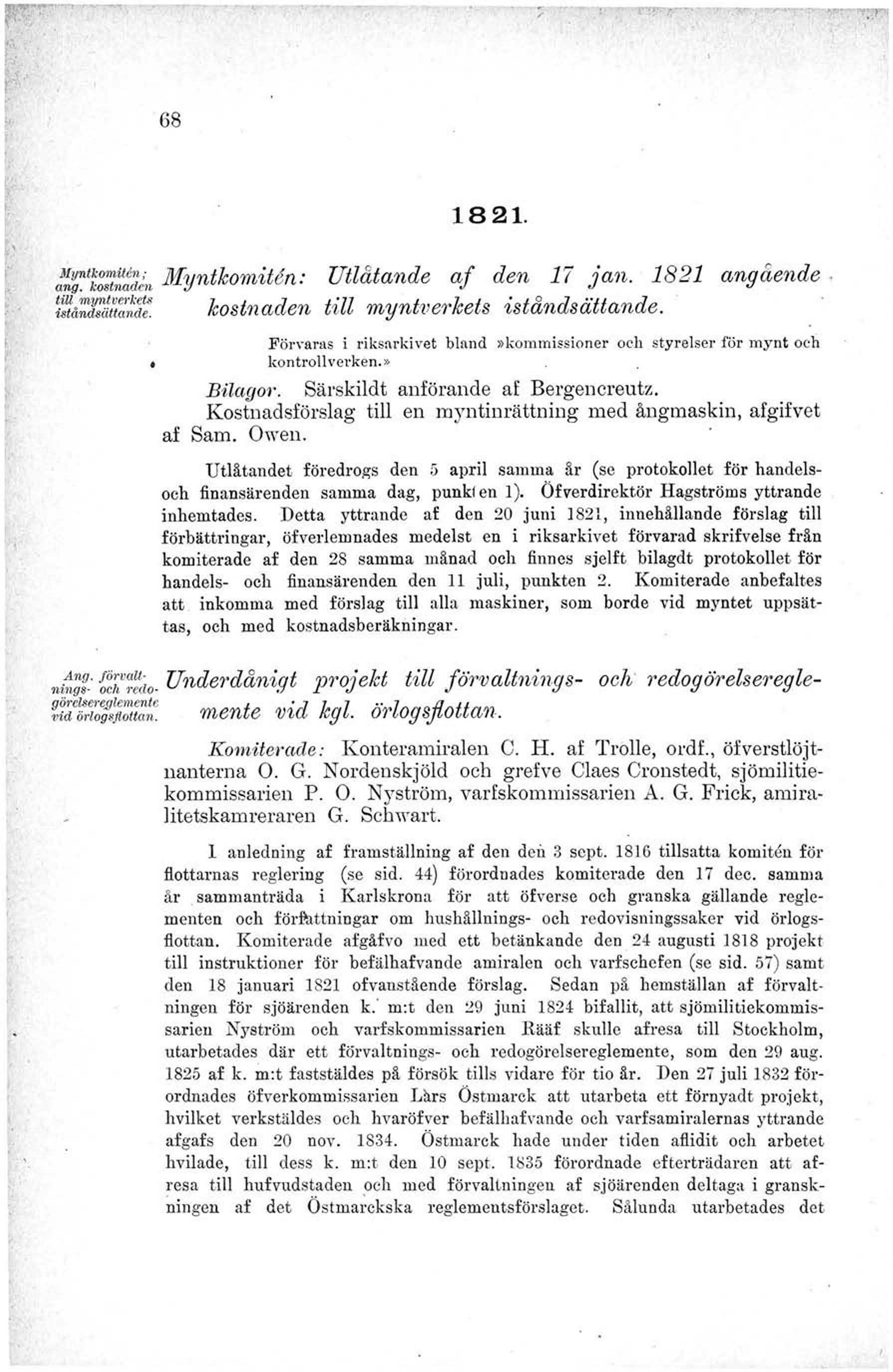 Myntkomitén: Utlåtande af den 17 jan. 1821 angående
