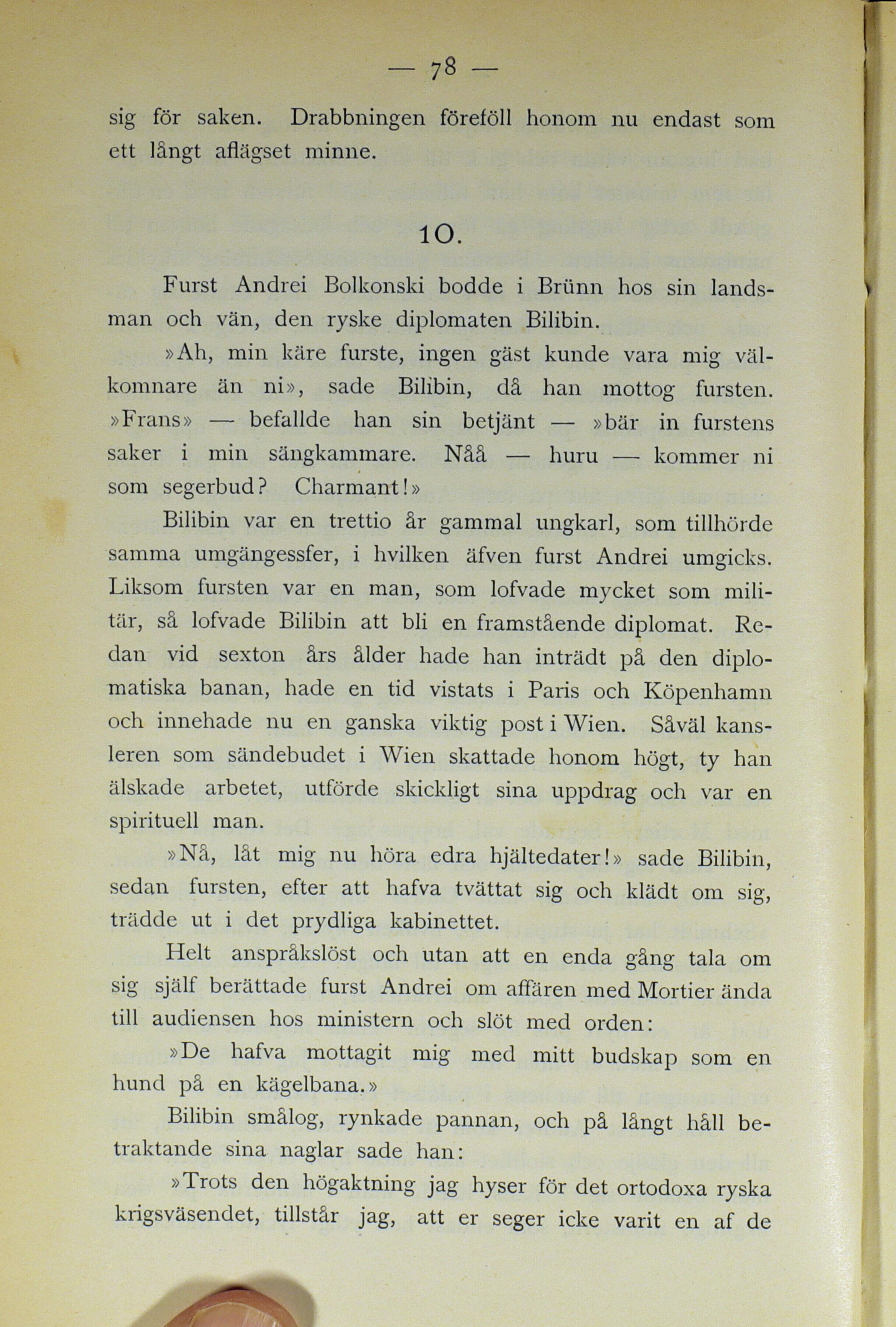 »Nå, låt mig nu höra edra hjältedater!» sade Bilibin,