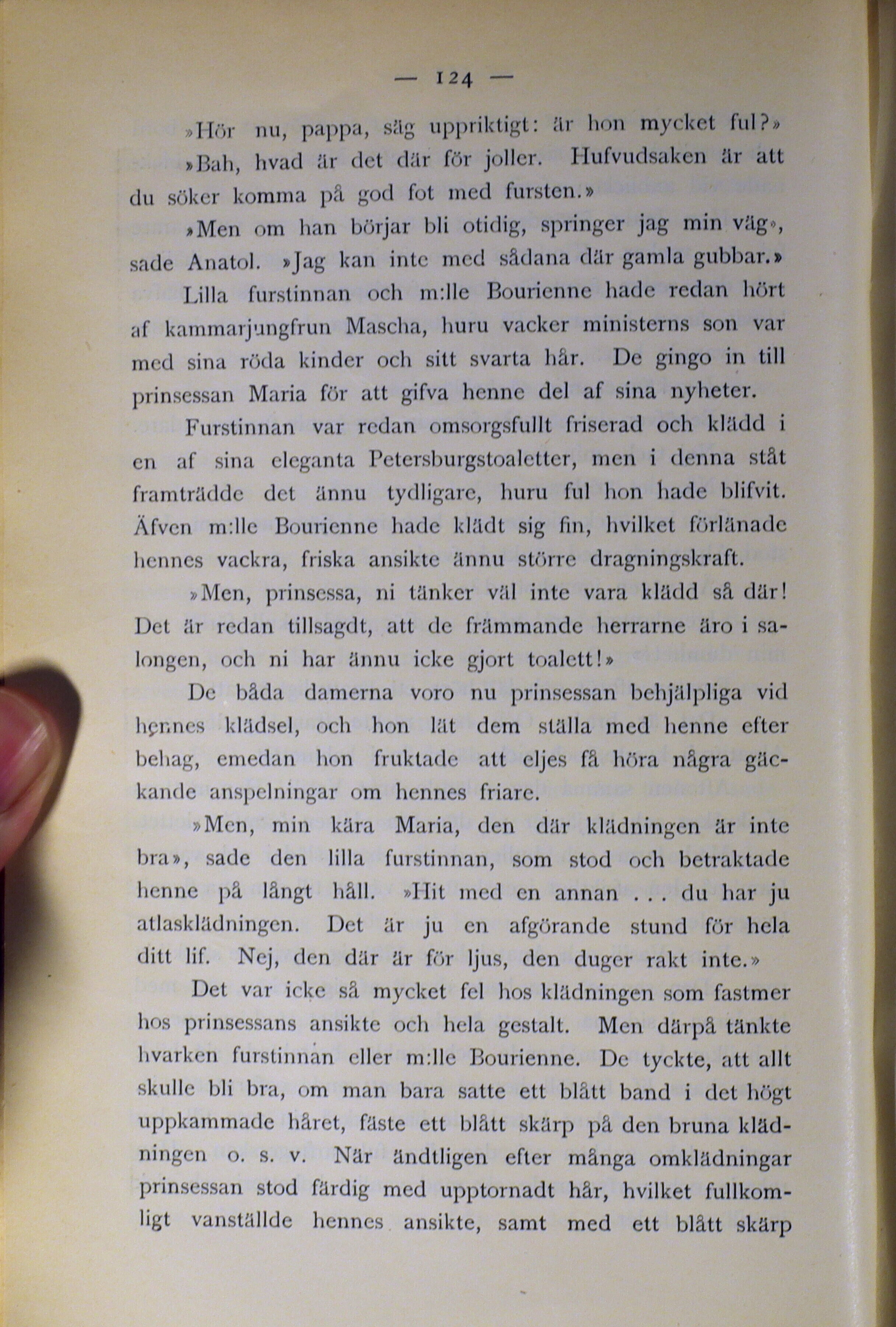 Äfven m:lle Bourienne hade klädt sig fin, hvilket förlänade