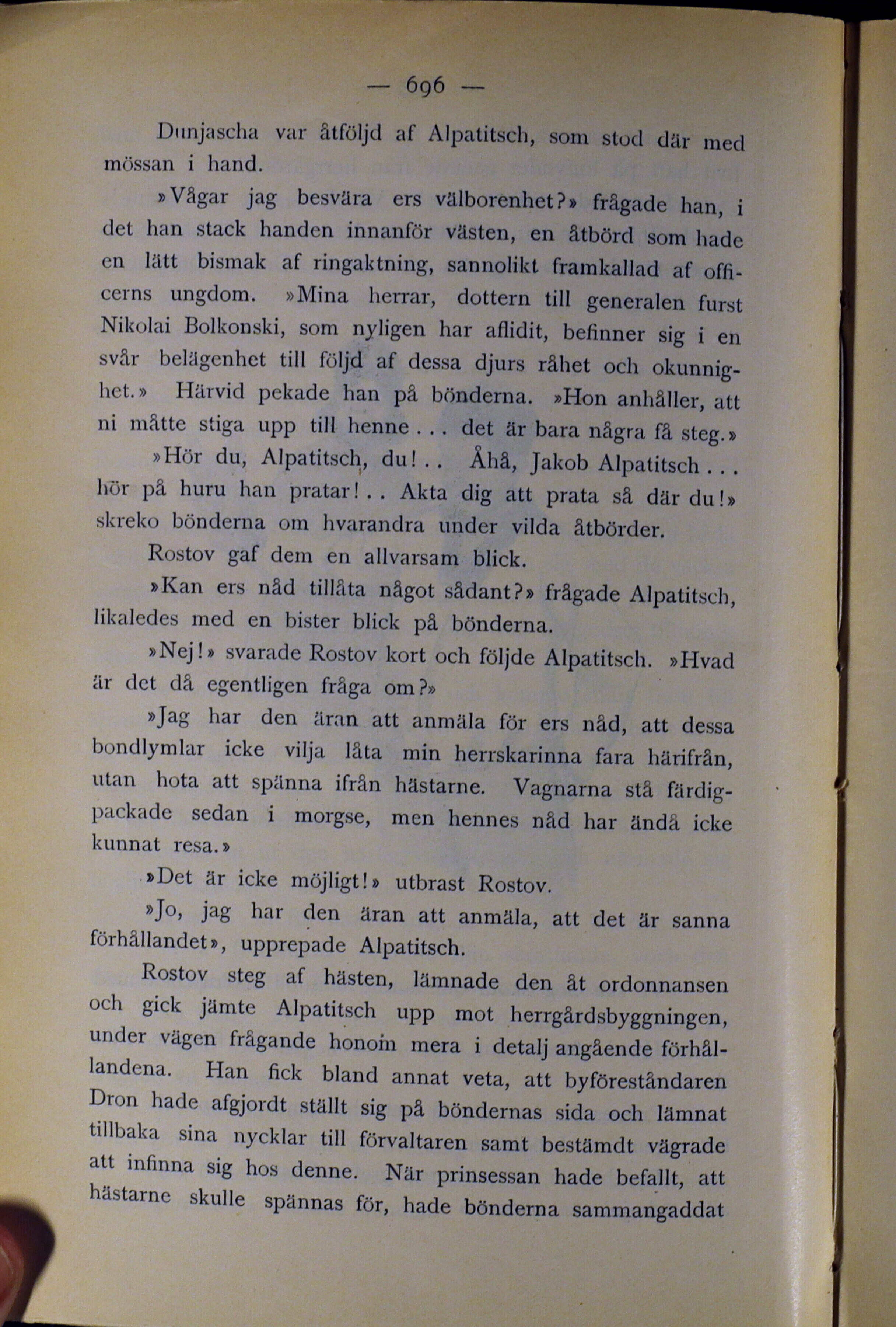 »Nej!» svarade Rostov kort och följde Alpatitsch. »Hvad