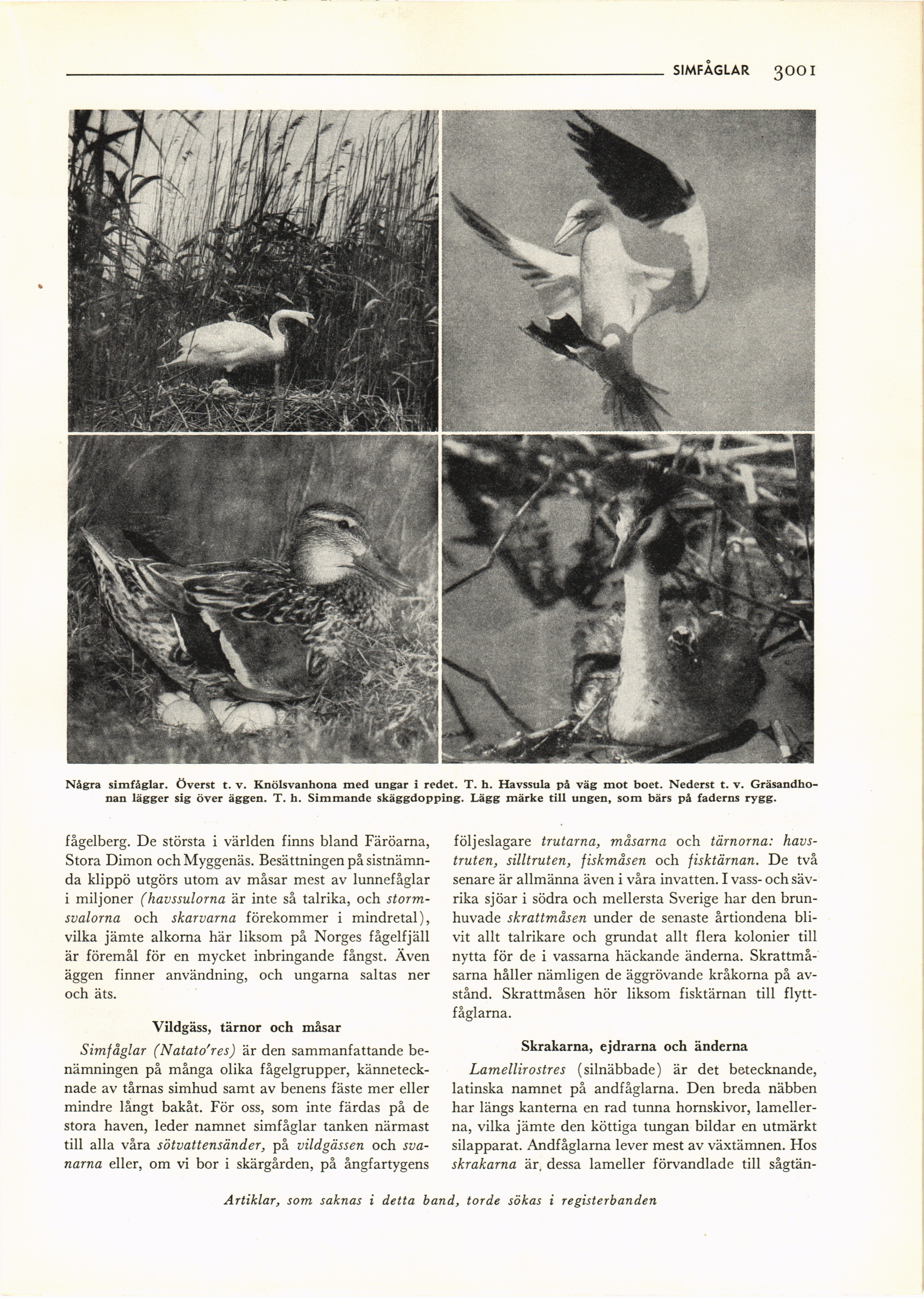 Några simfåglar. Överst t. v. Knölsvanhona med ungar i redet. T. h. Havssula på väg mot boet. Nederst t. v.