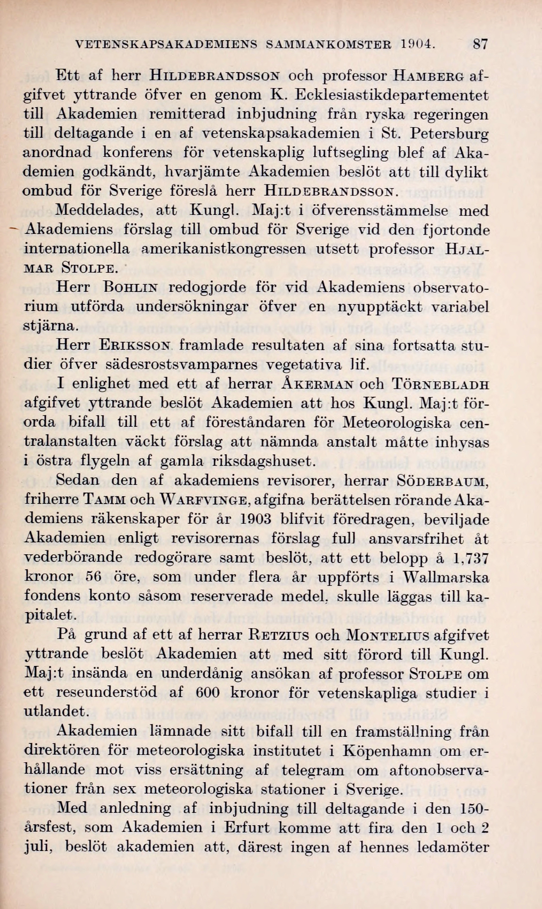 VETENSKAPSAKADEMIENS SAMMANKOMSTER 19()4. 87