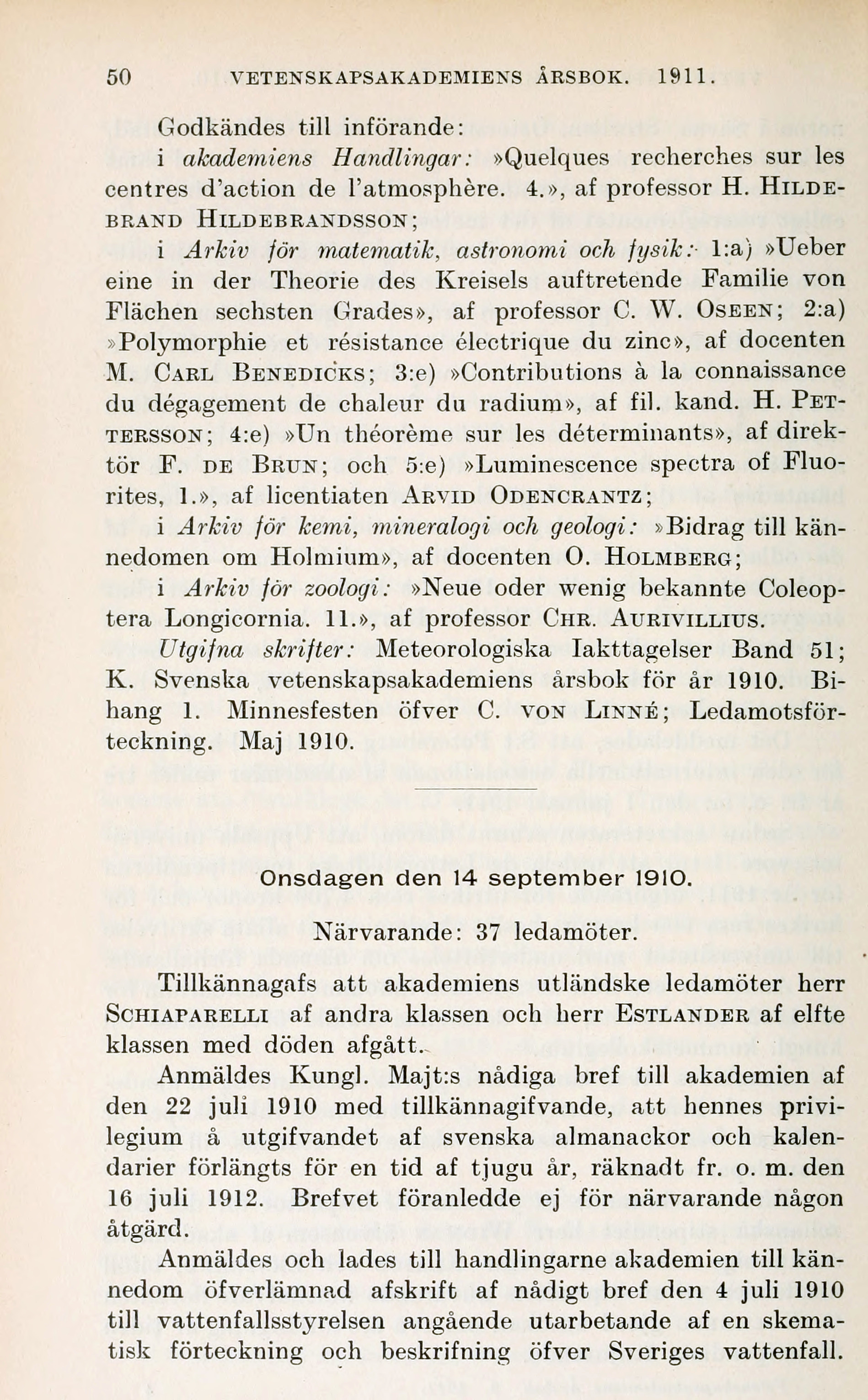 Full resolution (JPEG) - On this page / på denna sida - K. Vetenskapsakademiens sammankomster år 1910 - 1. Sammankomster för Akademiens egna ärenden - Onsdagen den 1 juni - Onsdagen den 14 september
