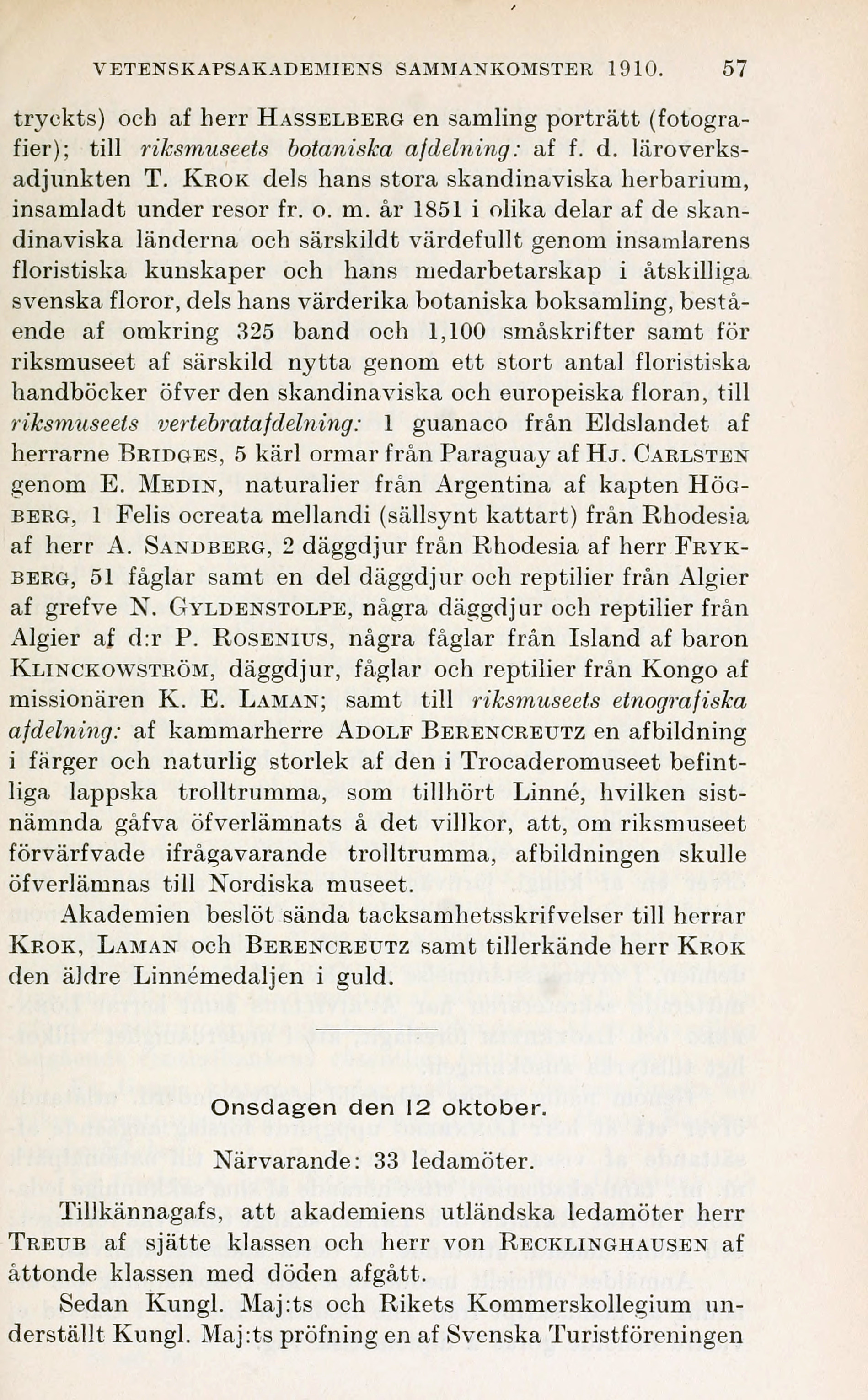Full resolution (JPEG) - On this page / på denna sida - K. Vetenskapsakademiens sammankomster år 1910 - 1. Sammankomster för Akademiens egna ärenden - Onsdagen den 14 september - Onsdagen den 12 oktober