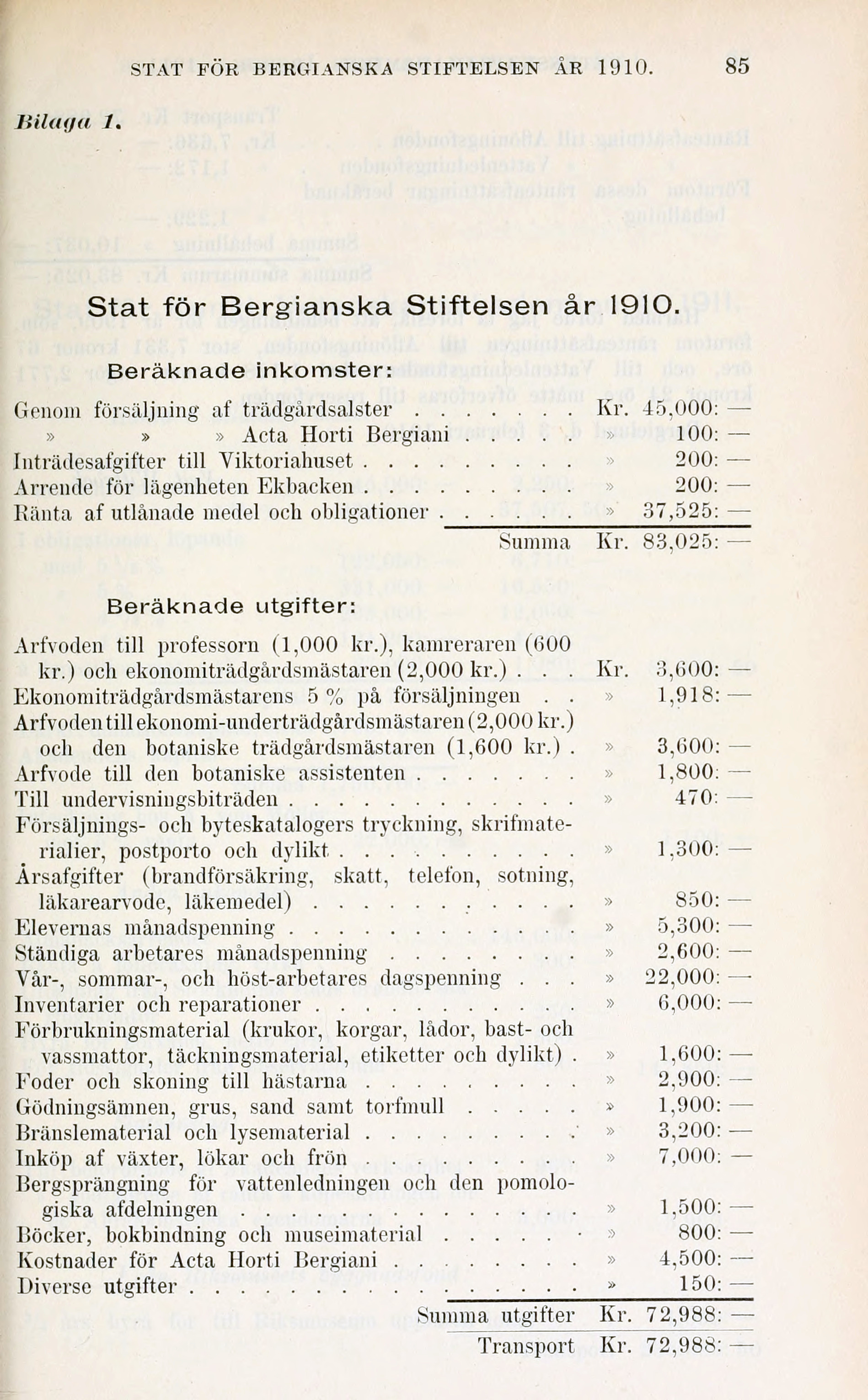 STAT FÖR BERGIANSKA STIFTELSEN ÅR 1910. 85