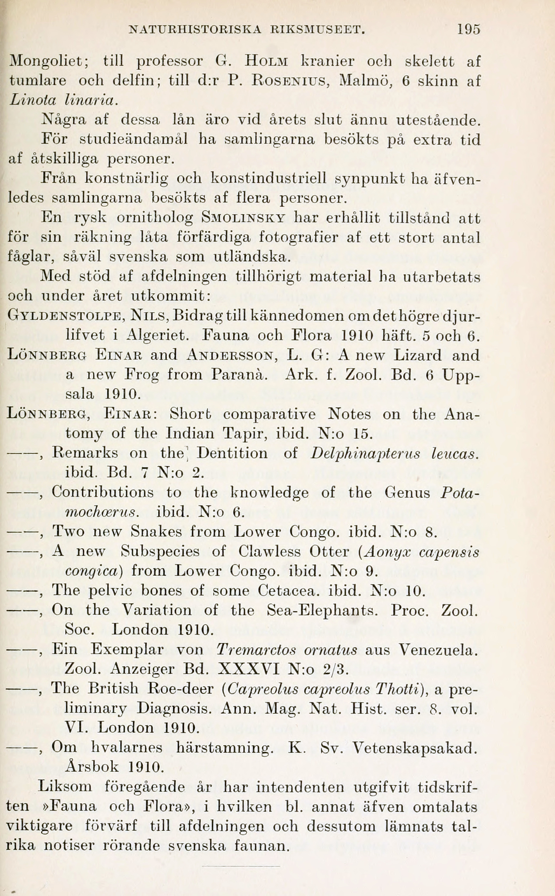 Full resolution (JPEG) - On this page / på denna sida - Institutionsföreståndarnas Årsberättelser - B. Naturhistoriska Riksmuseet - 8. Vertebratafdelningen