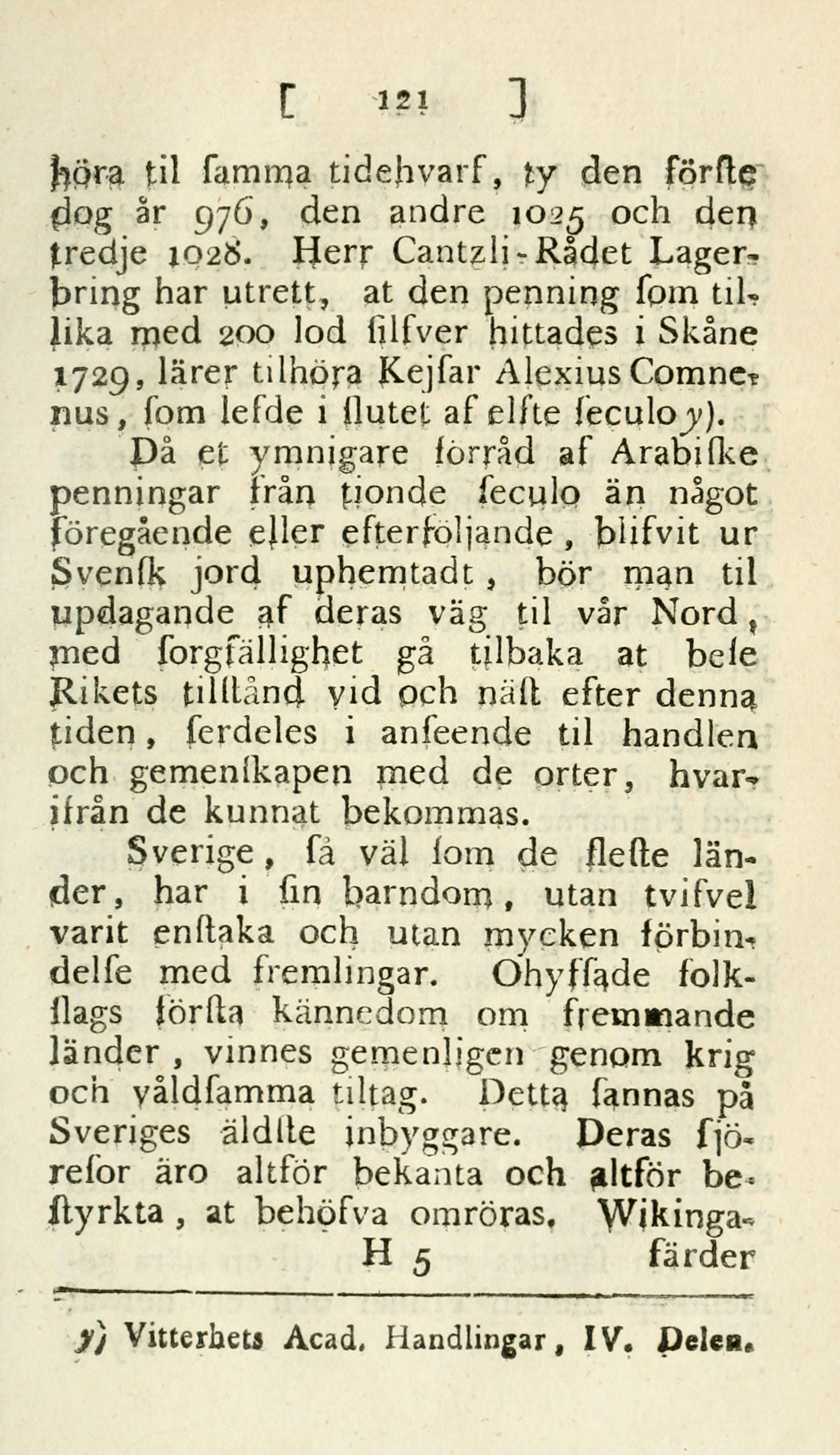 höra til ſamma tidehvarf, ty den förste dog år 976, den andre 1025 och den tredje 1028. Herr Cantzli-Rådet Lagerbring har utrett, at den penning ſom tillika med 200 lod ſilfver hittades i Skåne 1729, lärer tilhöra Kejſar Alexius Comnenus, ſom lefde i ſlutet af elfte ſeculo [1].