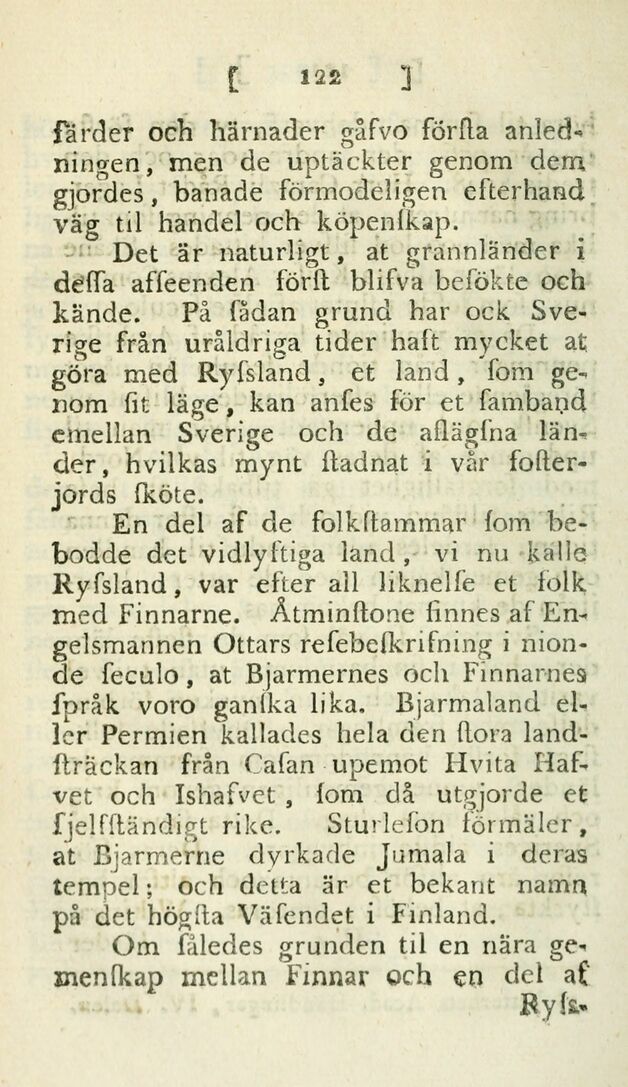En del af de folkstammar ſom bebodde det vidlyftiga land, vi nu kalle Ryſsland, var efter all liknelſe et folk med Finnarne. Åtminstone finnes af Engelsmannen Ottars reſebeſkrifning i nionde ſeculo, at Bjarmernes och Finnarnes ſpråk voro ganſka lika. Bjarmaland eller Permien kallades hela den ſtora landſträckan från Caſan upemot Hvita Hafvet och Ishafvet, ſom då utgjorde et ſjelfſtändigt rike. Sturleſon förmäler, at Bjarmerne dyrkade Jumala i deras tempel; och detta är et bekant namn på det högſta Väſendet i Finland.