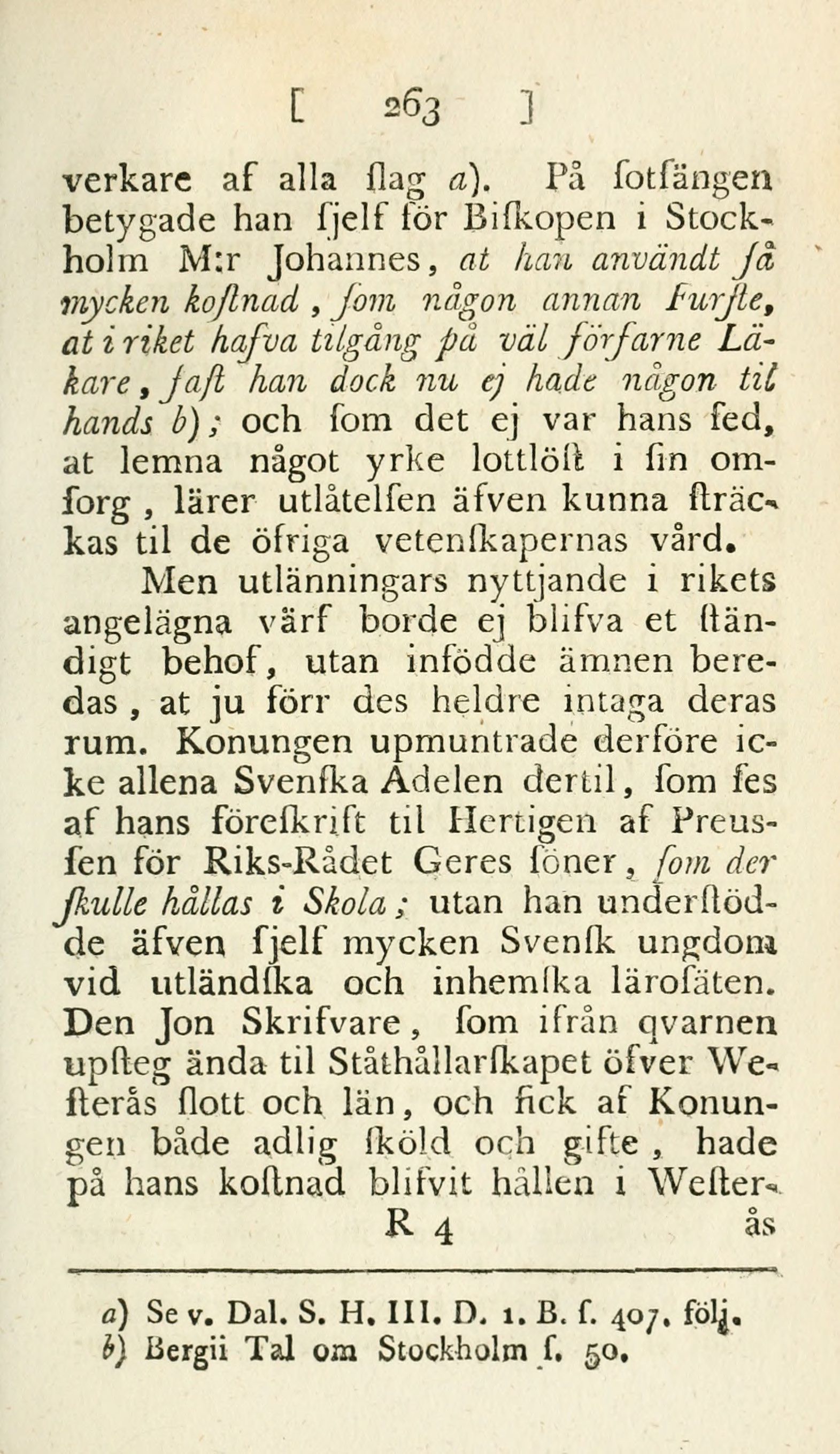 handtverkare af alla ſlag [1]. På ſotſängen betygade han ſjelf för Biſkopen i Stockholm M:r Johannes, at han användt ſå mycken koſtnad, ſom någon annan Furſte, at i riket hafva tilgång på väl förfarne Läkare, faſt kan dock nu ej hade någon til hands [2]; och ſom det ej var hans ſed, at lemna något yrke lottlöſt i ſin omſorg, lärer utlåtelſen äfven kunna ſträckas til de öfriga vetenſkapernas vård.