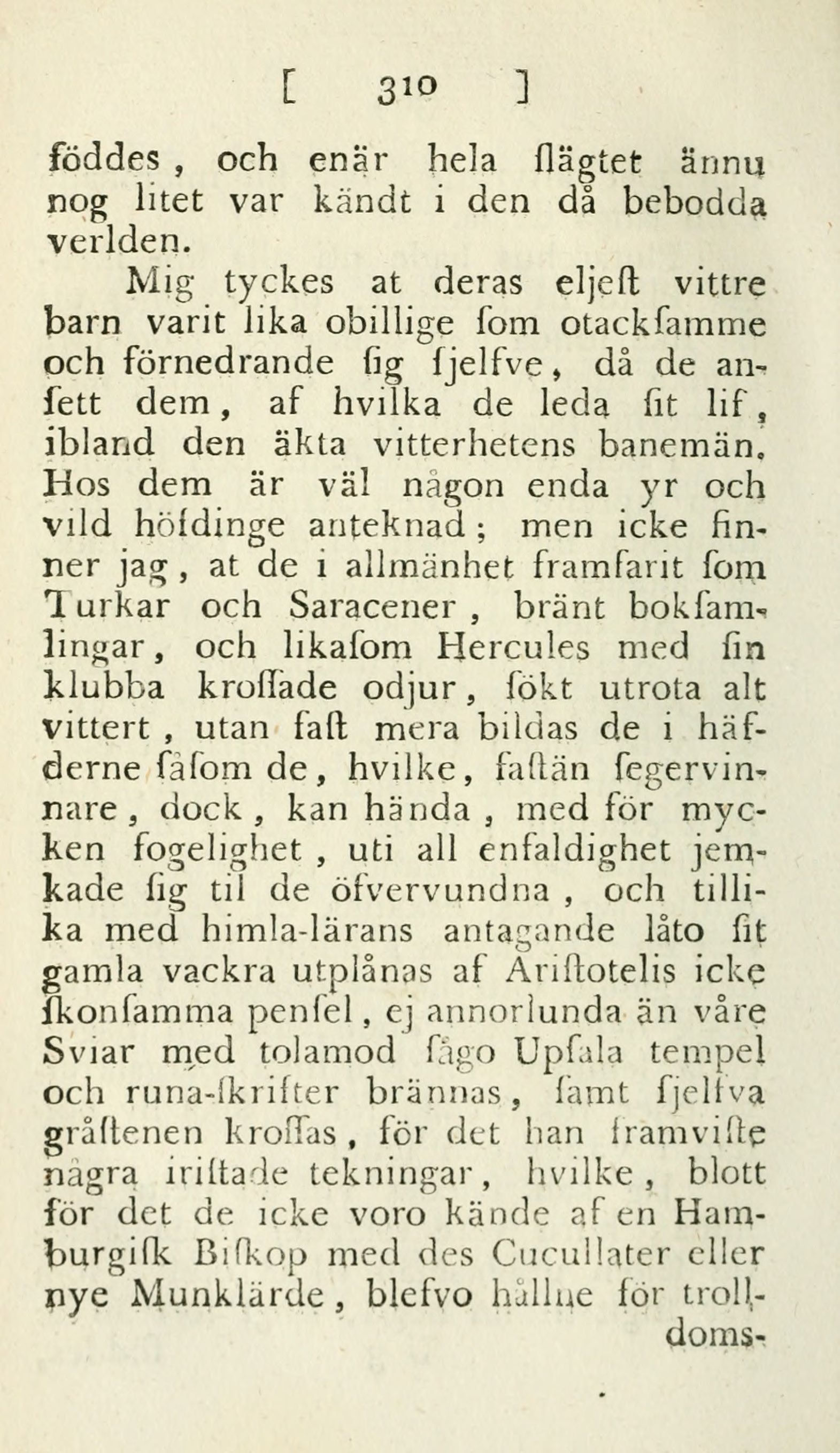 Mig tyckes at deras eljeſt vittre barn varit lika obillige ſom otackſamme och förnedrande ſig ſjelfve, då de anſett dem, af hvilka de leda ſit lif, ibland den äkta vitterhetens banemän. Hos dem är väl någon enda yr och vild höfdinge anteknad; men icke finner jag, at de i allmänhet framfarit ſom Turkar och Saracener, bränt bokſamlingar, och likaſom Hercules med ſin klubba kroſſade odjur, ſökt utrota alt vittert, utan faſt mera bildas de i häfderne ſåſom de, hvilke, faſtän ſegervinnare, dock, kan hända, med för mycken fogelighet, uti all enfaldighet jemkade ſig til de öfvervundna, och tillika med himla-lärans antagande låto ſit gamla vackra utplånas af Ariſtotelis icke ſkonſamma penſel, ej annorlunda än våre Sviar med tolamod ſågo Upſala tempel och runa-ſkrifter brännas, ſamt ſjelfva gråſtenen kroſſas, för det han framviſte några iriſtade tekningar, hvilke, blott för det de icke voro kände af en Hamburgiſk Biſkop med des Cucullater eller nye Munklärde, blefvo hållne för