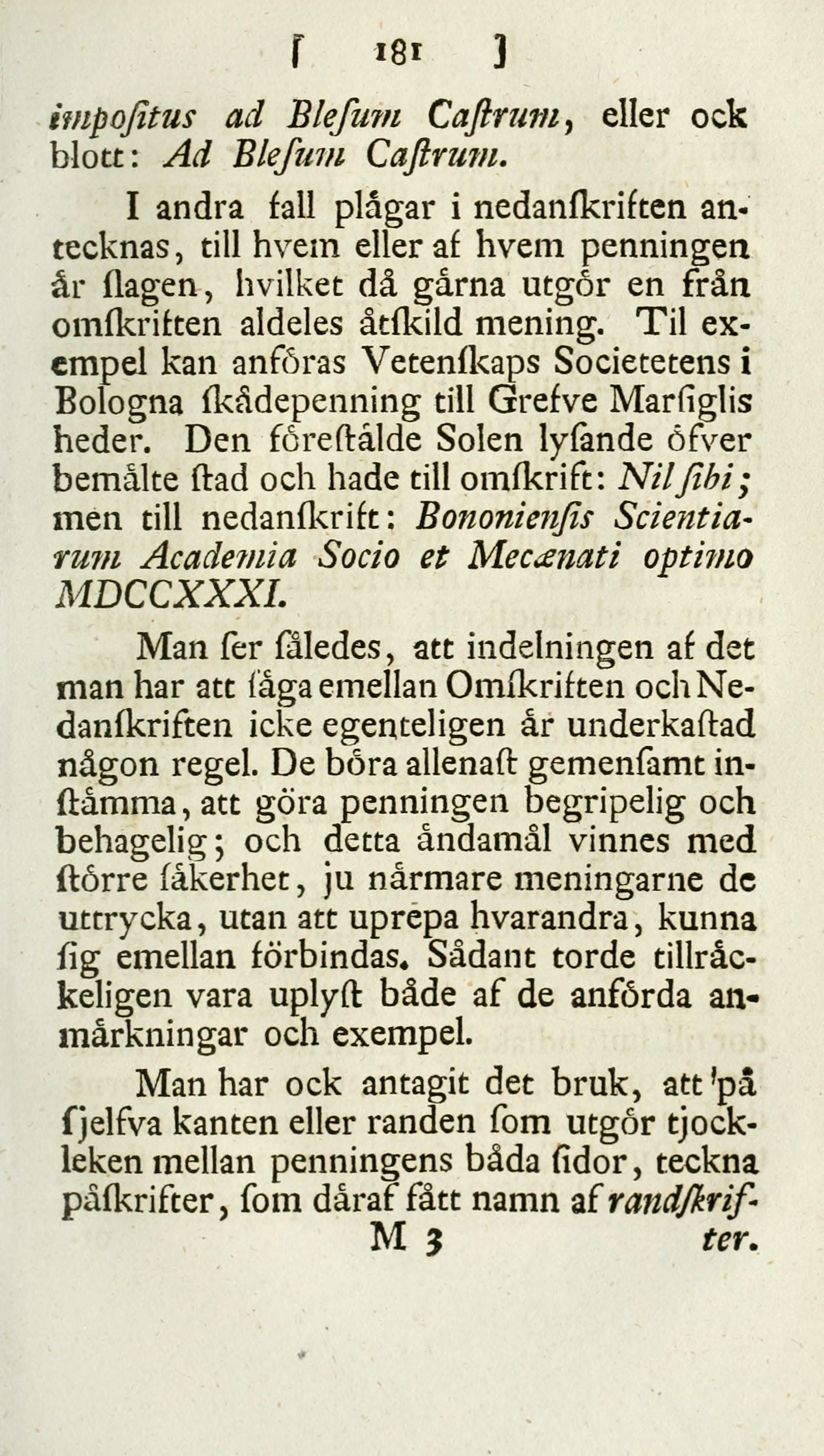 Man ser således, att indelningen af det man har att säga emellan Omskriften och Nedanskriften icke egenteligen är underkastad någon regel. De böra allenast gemensamt instämma, att göra penningen begripelig och behagelig; och detta ändamål vinnes med större säkerhet, ju närmare meningarne de uttrycka, utan att uprepa hvarandra, kunna sig emellan förbindas. Sådant torde tillräckeligen vara uplyst både af de anförda anmärkningar och exempel.