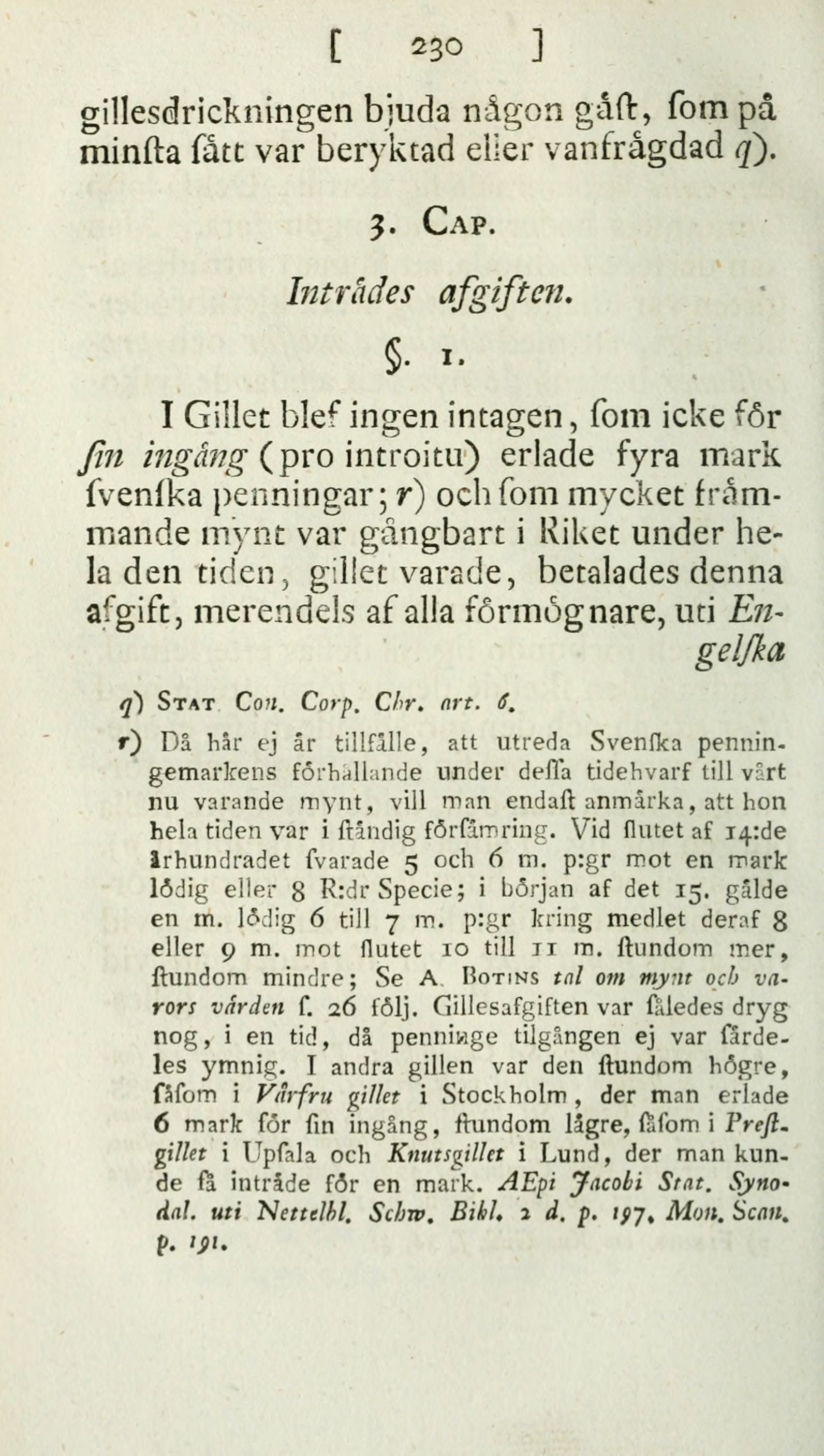[2] Då här ej är tillfälle, att utreda Svenska penningemarkens förhållande under dessa tidehvarf till vårt nu varande mynt, vill man endast anmärka, att hon hela tiden var i ständig försämring. Vid slutet af 14:de århundradet svarade 5 och 6 m. p:gr mot en mark lödig eller 8 R:dr Specie; i början af det 15. gälde en m. lödig 6 till 7 m. p:gr kring medlet deraf 8 eller 9 m. mot slutet 10 till 11 m. stundom mer, stundom mindre; Se A. Botins tal om mynt och varors värden s. 26 följ. Gillesafgiften var således dryg nog, i en tid, då penninge tilgången ej var särdeles ymnig. I andra gillen var den stundom högre, såsom i Vårfru gillet i Stockholm , der man erlade 6 mark för sin ingång, stundom lägre, såsom i Prestgillet i Upsala och Knutsgillet i Lund, der man kunde få inträde för en mark. AEpi Jacobi Stat. Synodal. uti Nettelbl. Schwv. Bibl 2 d. p. 197.Mon. Scan. p. 191.